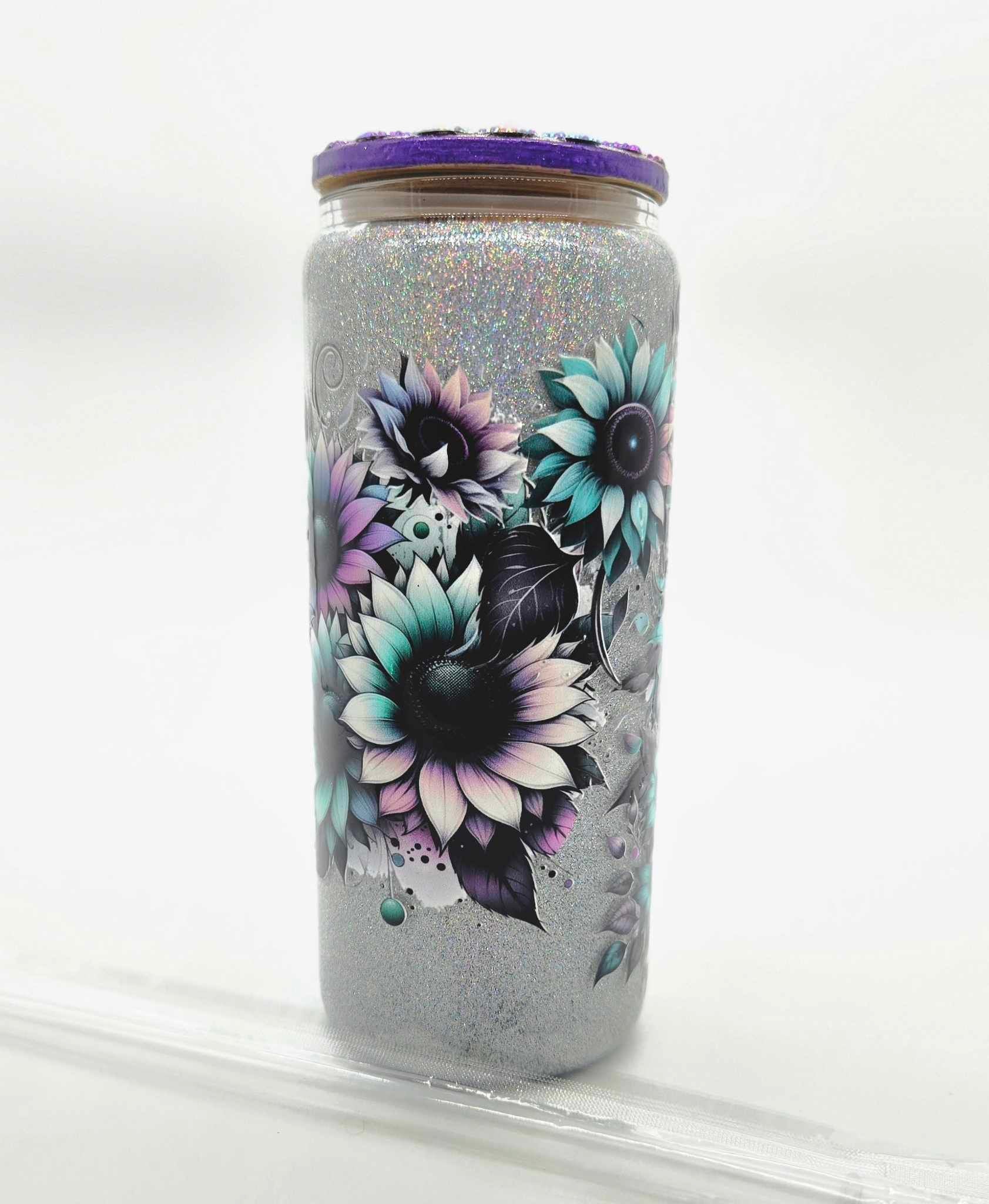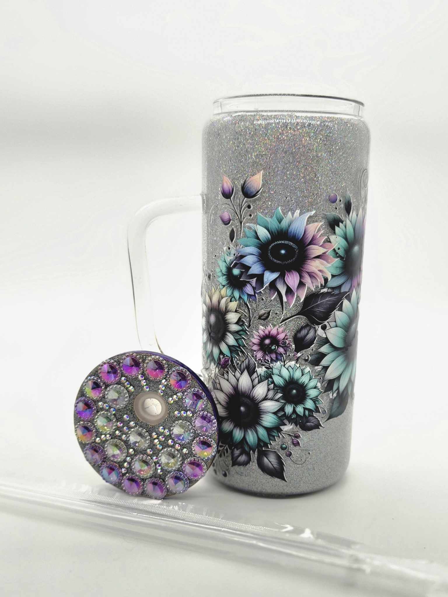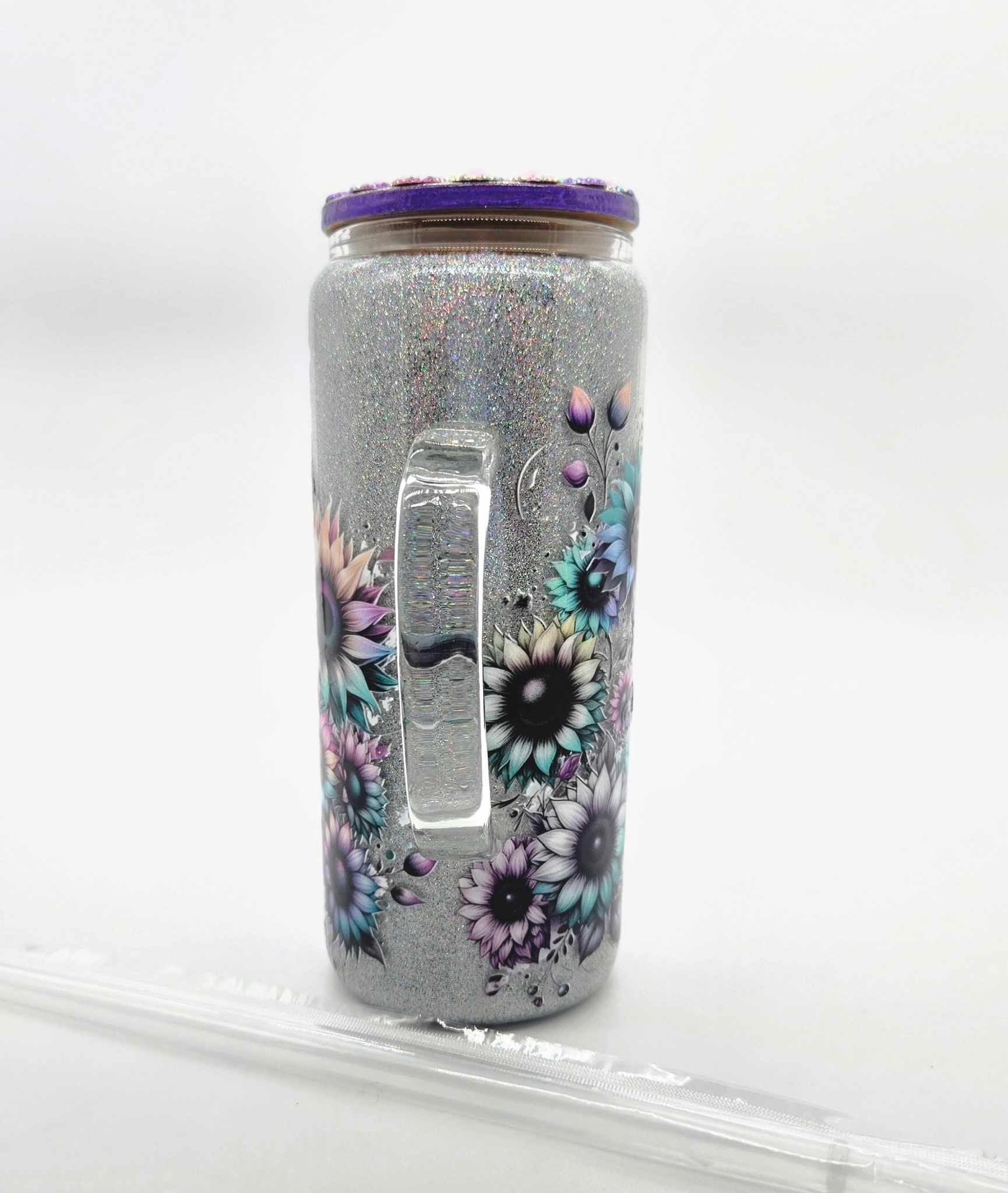 Step into a world of shimmer and elegance with our Midnight Bloom Sparkle glass snow globe cup. This 20oz handled tumbler is a showstopper — featuring a cascade of pastel sunflowers in dreamy purples, soft blues, and radiant whites set against a silver glittered backdrop. The real magic? A sparkling snow globe effect that dances with every movement!