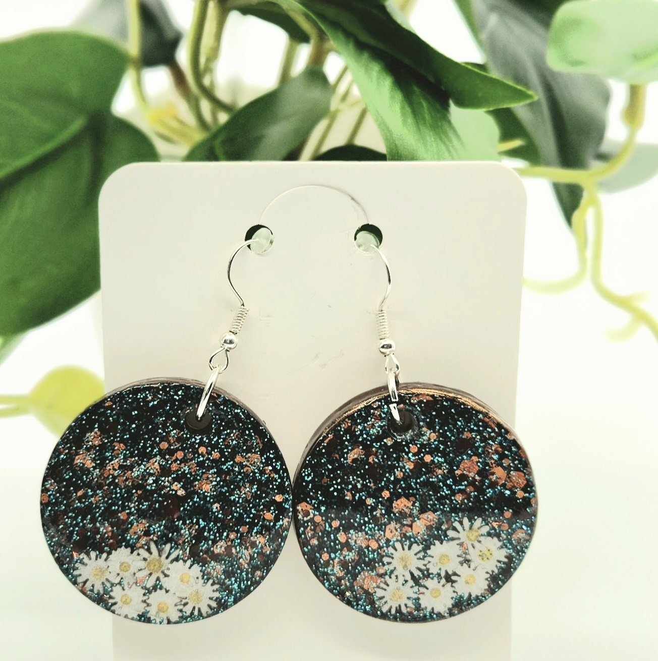 Step into a field of flowers under a starry sky with our Midnight Meadow Round Earrings. These enchanting circular dangles feature a deep black base sprinkled with shimmering teal and copper glitter, creating the illusion of a sparkling night sky. At the bottom, delicate white daisies bloom—capturing the magic of a wildflower meadow in the moonlight. Lightweight and whimsical, these earrings are perfect for anyone who loves a little sparkle and floral charm.