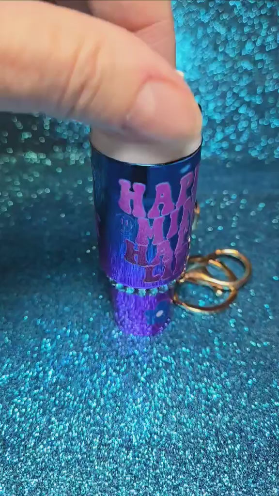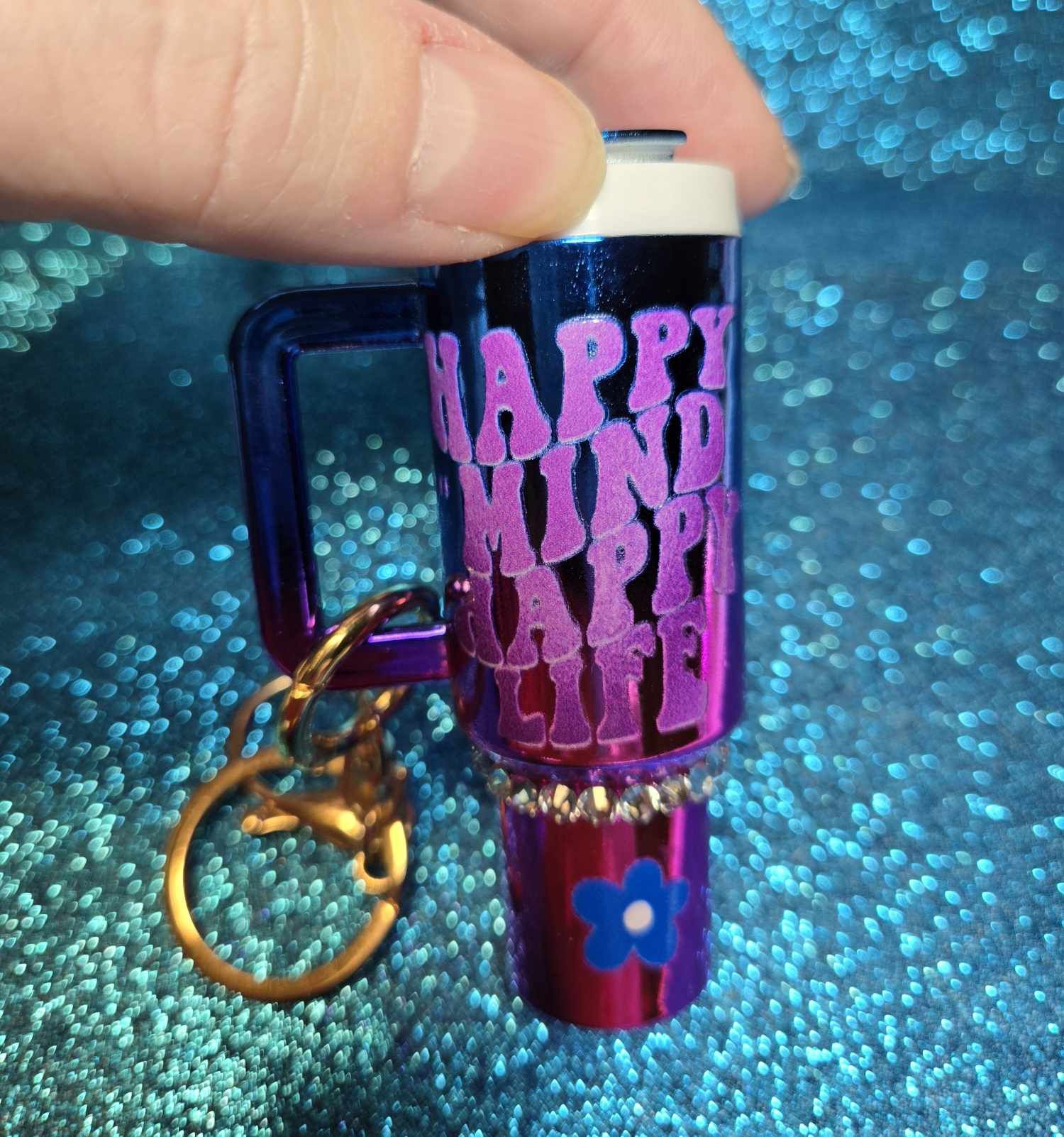 Embrace positivity on the go with our "Mindful Moments Mini Tumbler Keychain". Featuring the empowering slogan "Happy Mind, Happy Life" set against a striking metallic pink background, this keychain is a daily reminder to maintain a joyful and serene mindset. The vibrant text is complemented by a subtle flower accent, adding a touch of elegance to this motivational piece. Perfect for those who appreciate a blend of style and inspiration, this mini tumbler comes equipped with a secure lid and a sturdy key ring, making it a functional and fashionable accessory for anyone looking to uplift their spirits and organize their essentials with ease.
