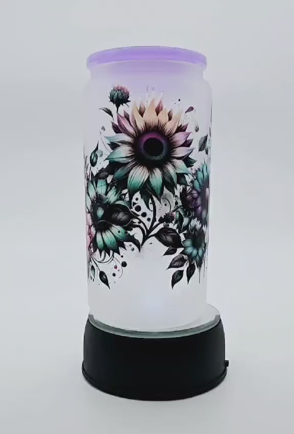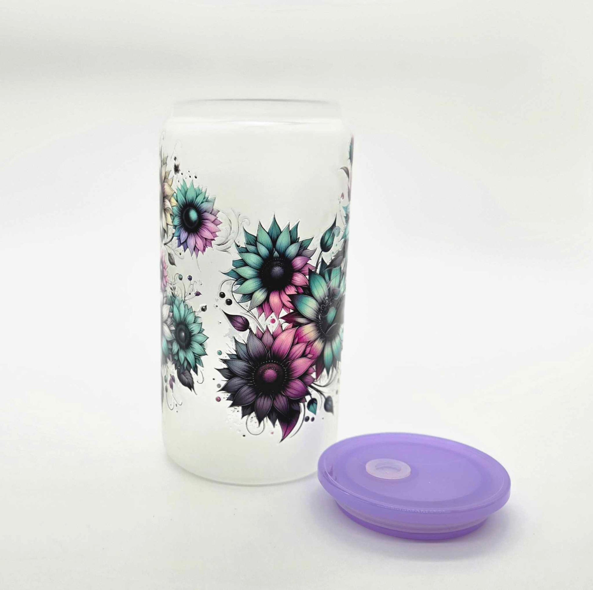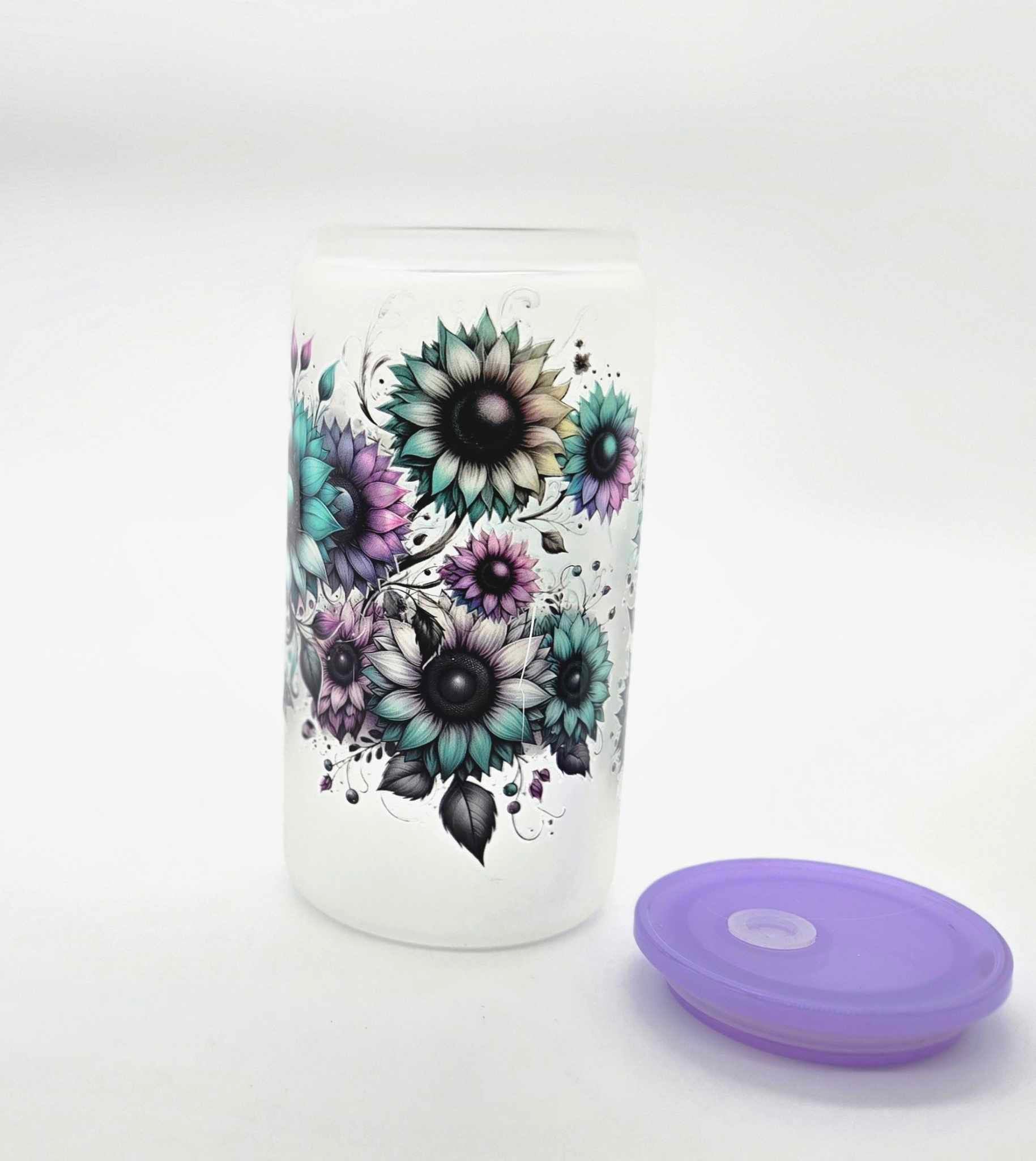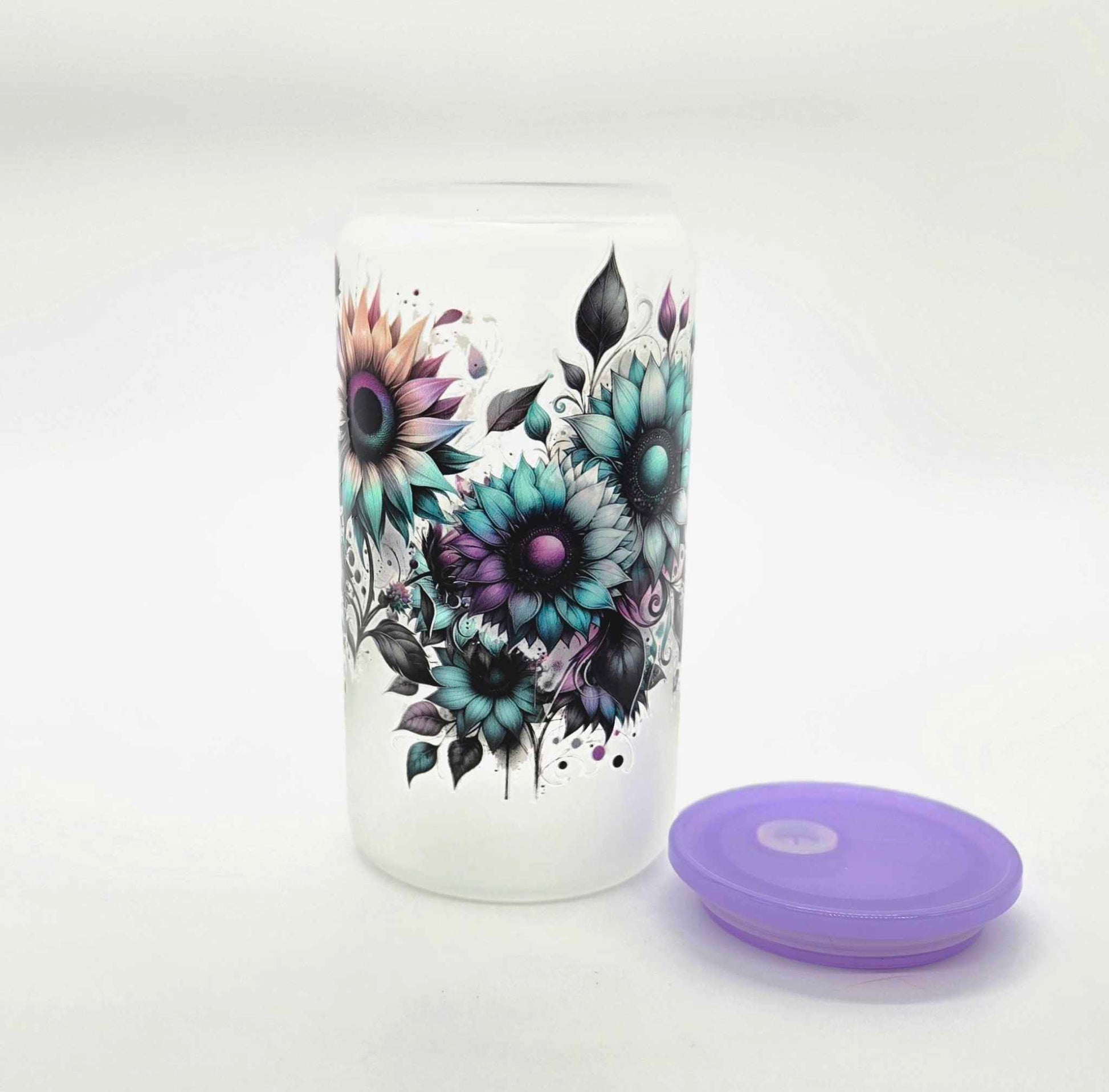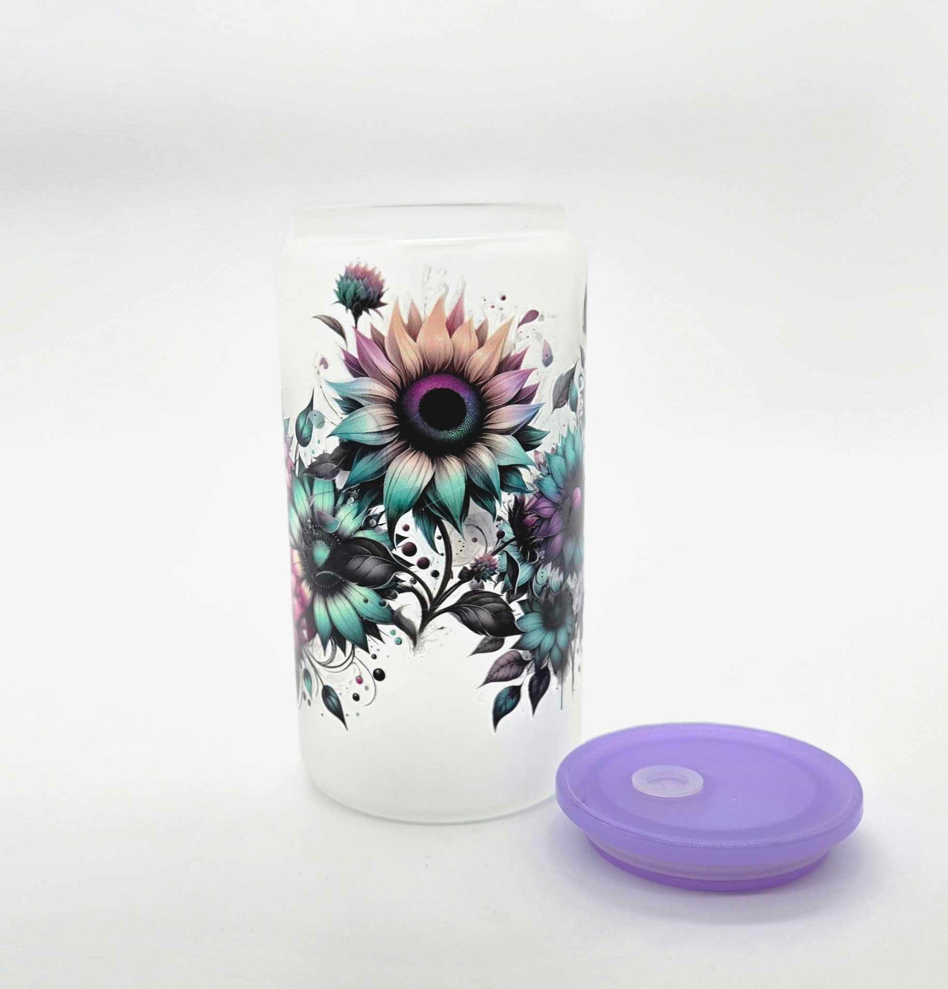 Add a bold and magical flair to your drinkware with the Mystic Bloom Sunflower Glass Tumbler! This 16-ounce frosted glass tumbler is wrapped in dramatic sunflower artwork in striking shades of teal, violet, and midnight black. Paired with a dreamy lavender silicone lid, this tumbler brings both beauty and function to your daily routine.