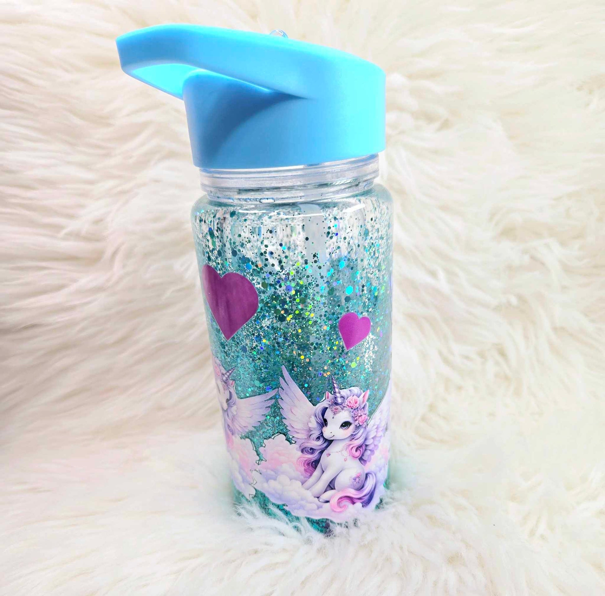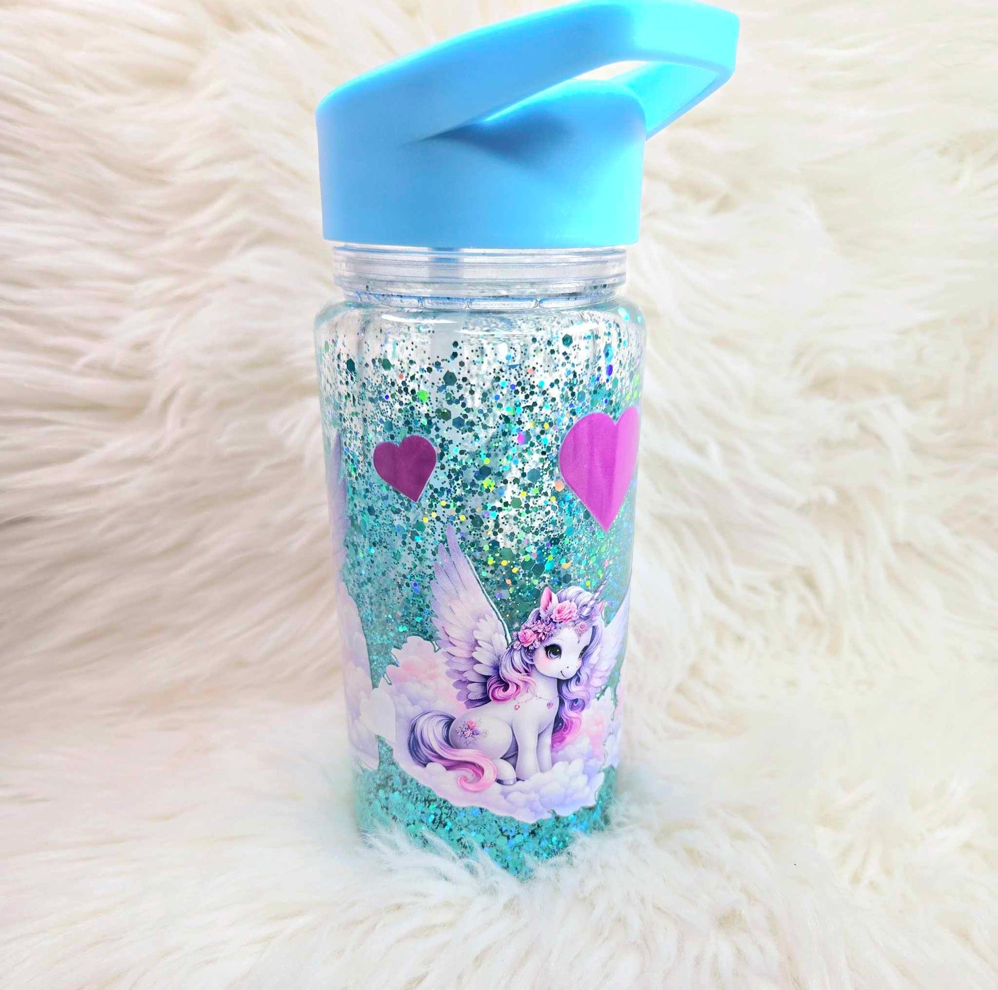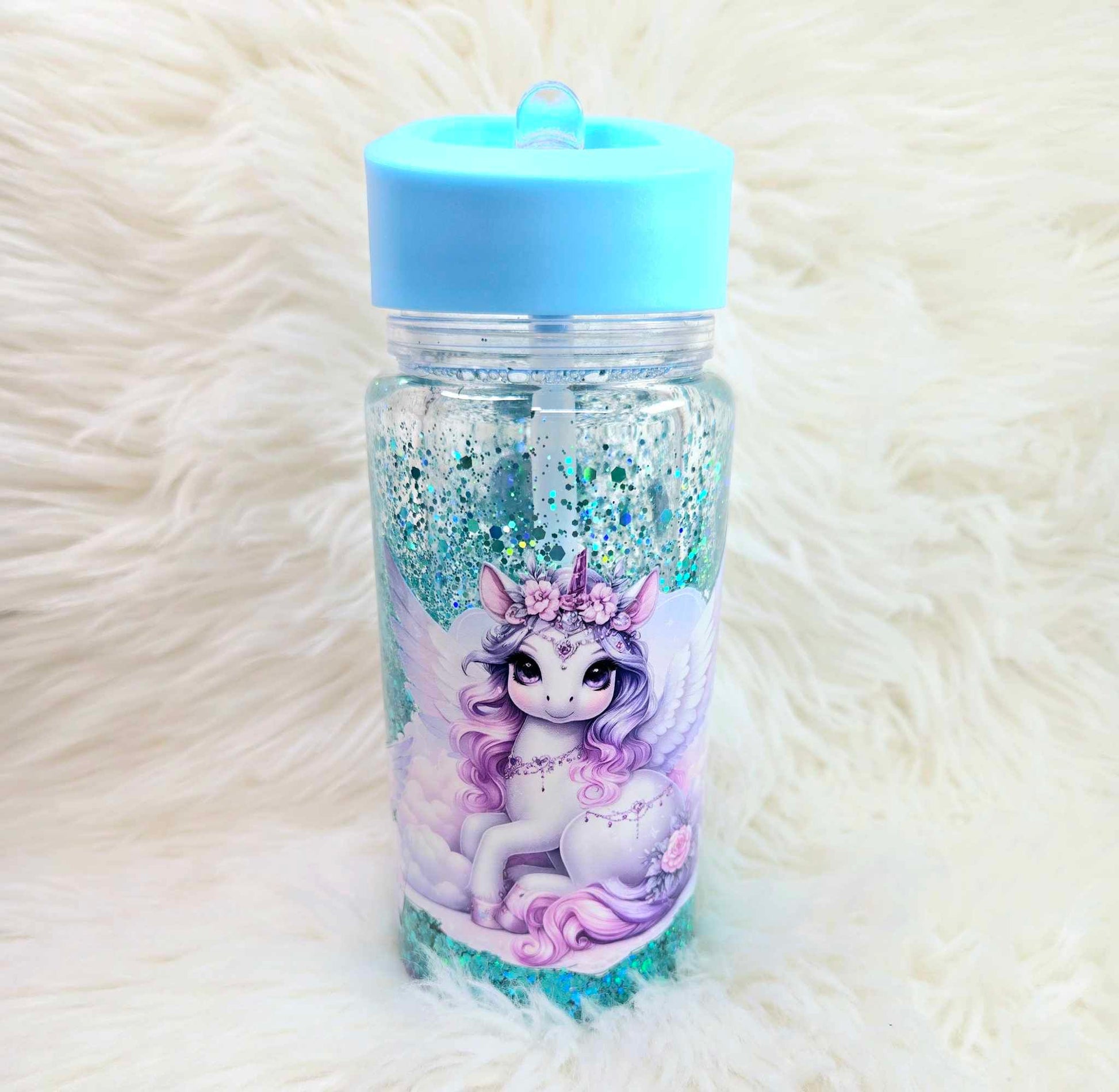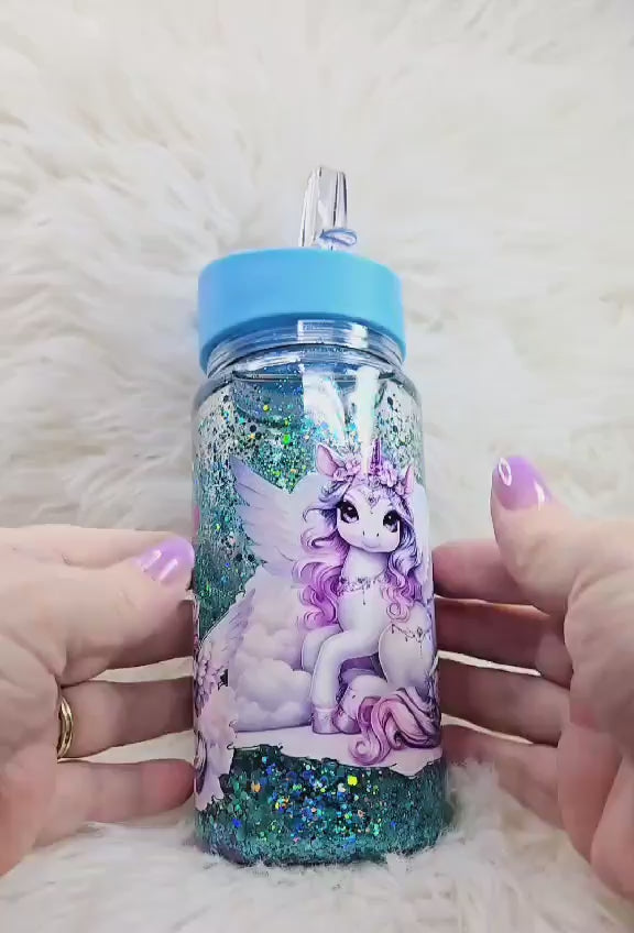 Step into a fairy-tale with our "Mystic Dreams Unicorn Snow Globe Tumbler." This enchanting 10 oz tumbler is adorned with a serene unicorn surrounded by gentle clouds and soft pink hearts, set against a sparkling teal glitter backdrop that mimics a magical sky. Perfect for those who believe in a touch of magic, the tumbler features a durable blue lid with an easy-to-carry handle, ideal for keeping your favorite drinks safe while you embark on daily adventures. It's a dreamy addition to any collection, perfect for gifting or simply treating yourself to a little bit of magic every day.