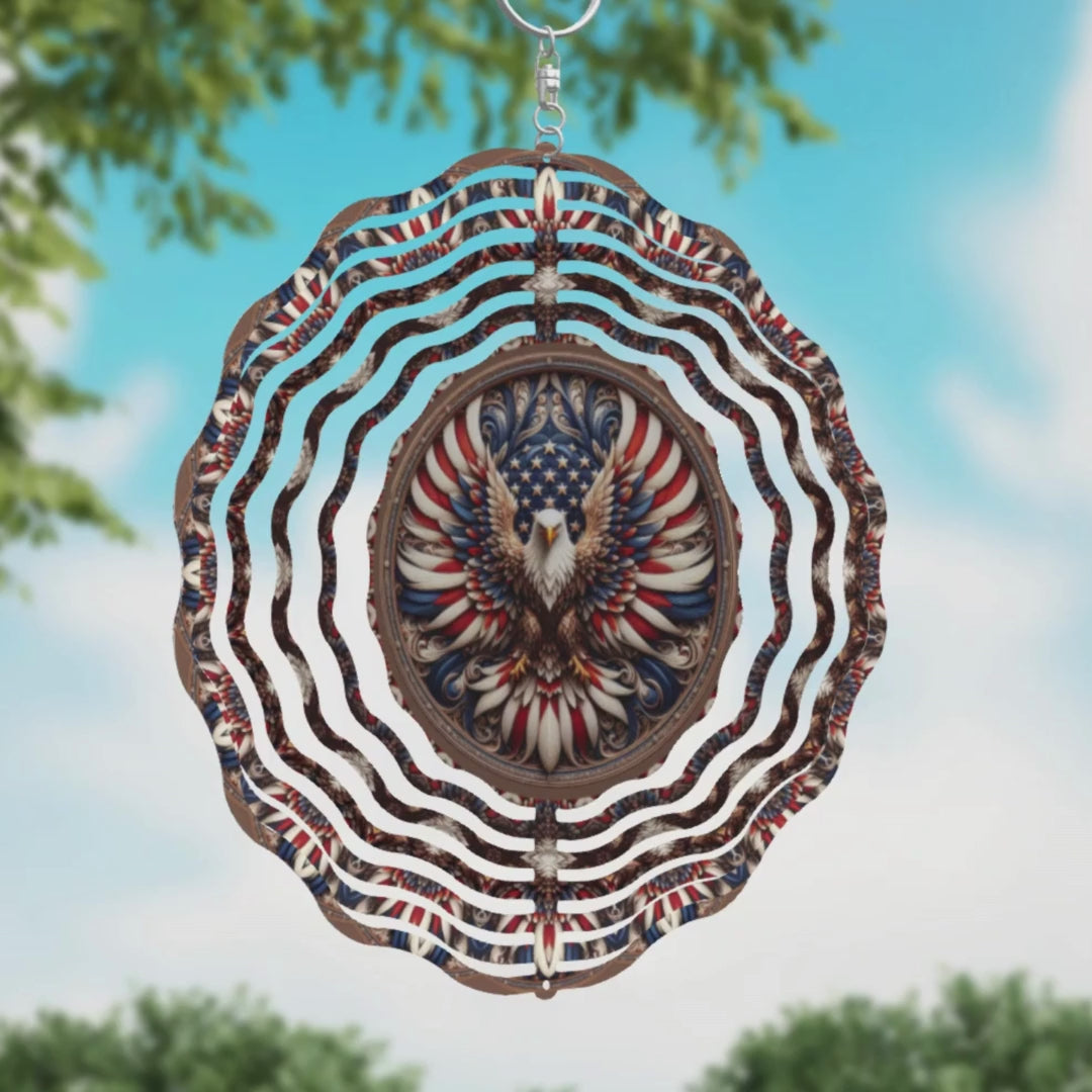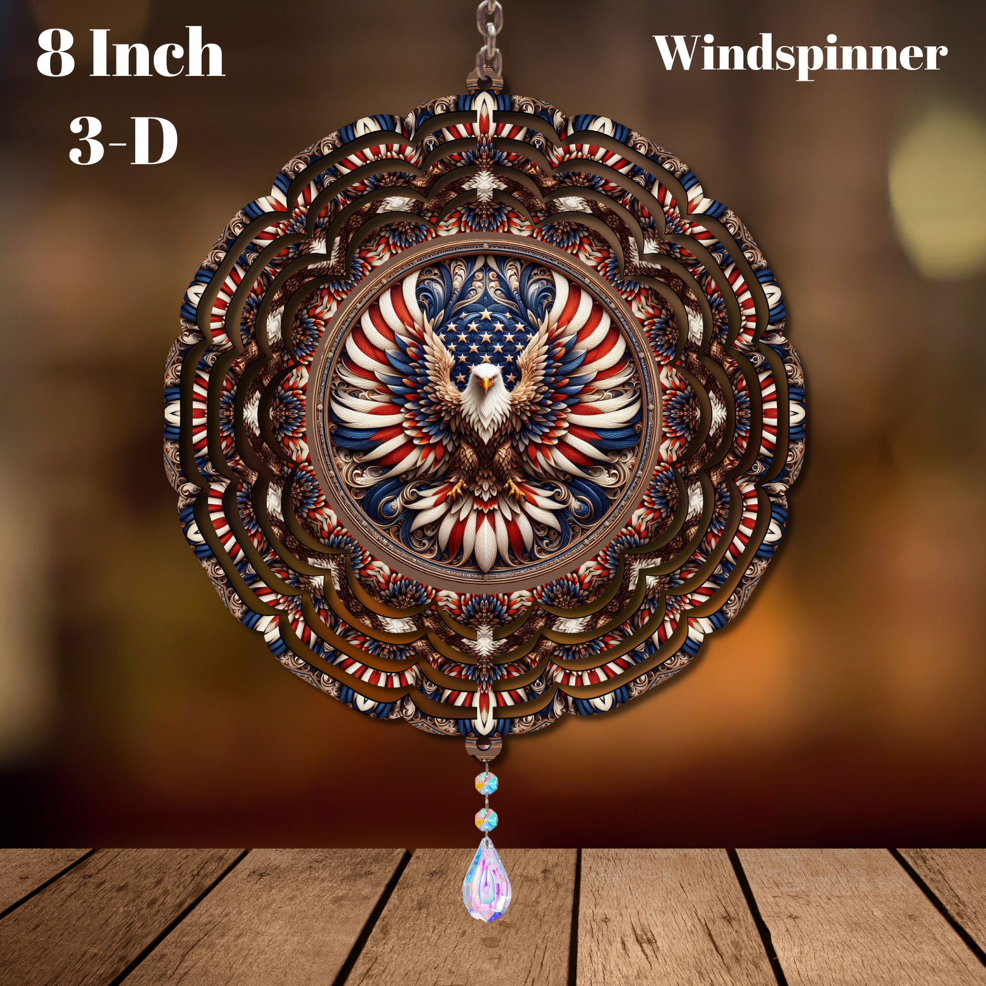 Let your pride spin in the wind with our Patriot Eagle 3D Windspinner. Measuring 8 inches in diameter, this bold and intricate piece features a stunning bald eagle with outstretched wings over a vivid American flag background. The layered 3D design creates a mesmerizing motion that catches light and breeze, bringing depth and movement to your porch, patio, or garden. Made for those who love freedom, strength, and standout décor, this spinner includes a crystal drop accent for added sparkle and balance.