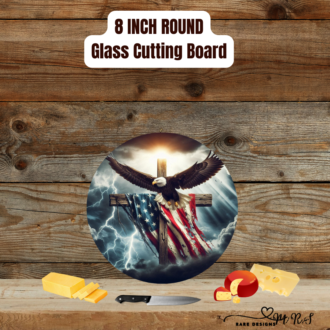 Bring meaning to every slice. This 8-inch round tempered glass cutting board showcases a dramatic scene—bald eagle over a wooden cross draped in the American flag, lit by storm-kissed skies. The textured, heat-resistant glass protects countertops, resists odors and stains, and cleans up fast. Non-slip feet keep it steady while chopping, and it doubles beautifully as a cheese/charcuterie server or trivet. A powerful piece for kitchens, coffee bars, and buffets—and a thoughtful gift for veterans, first responders, and people of faith. Designed and sublimated by MRS Rare Designs.