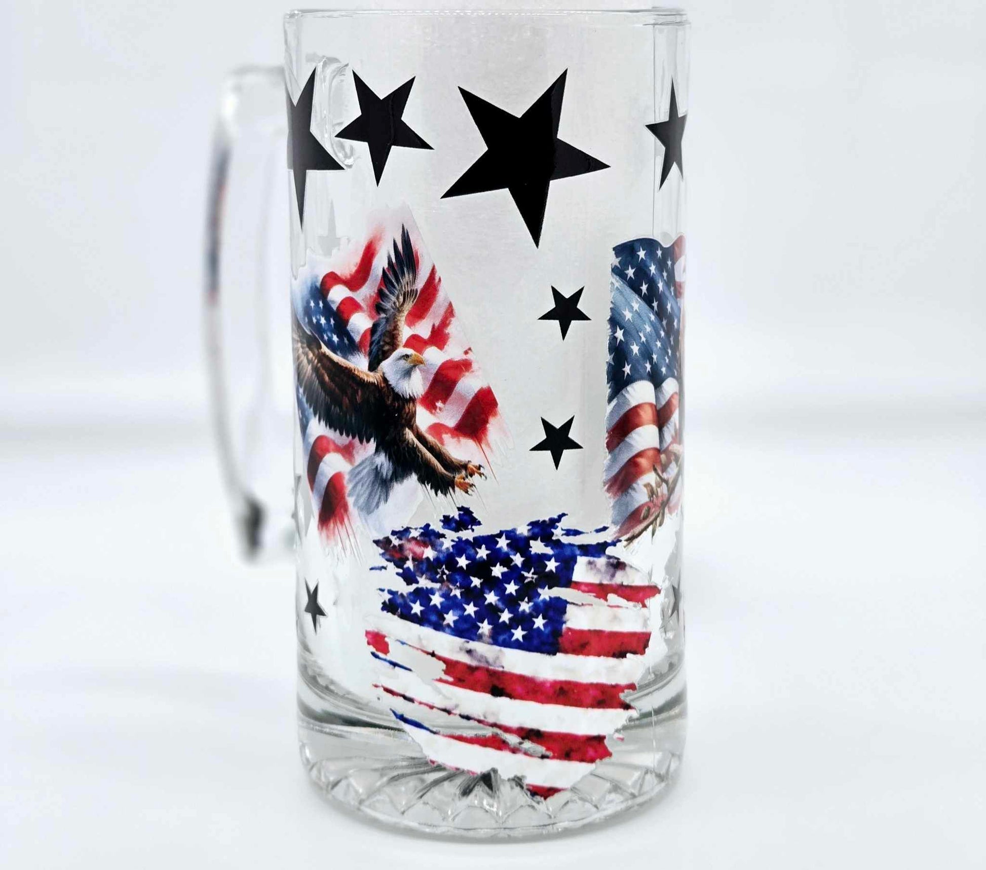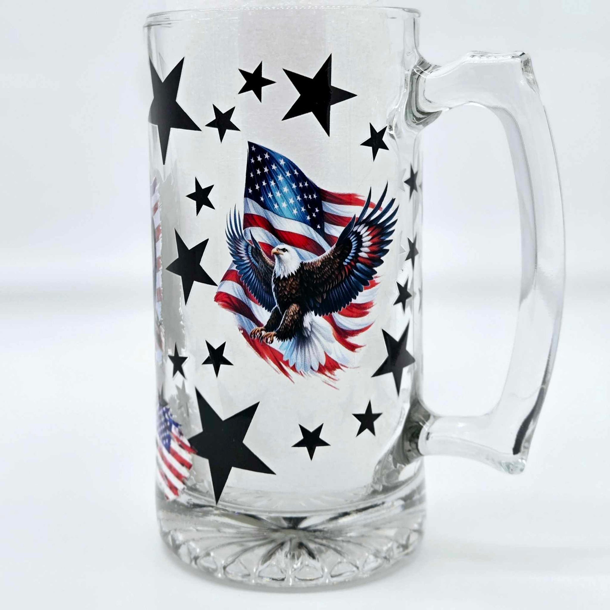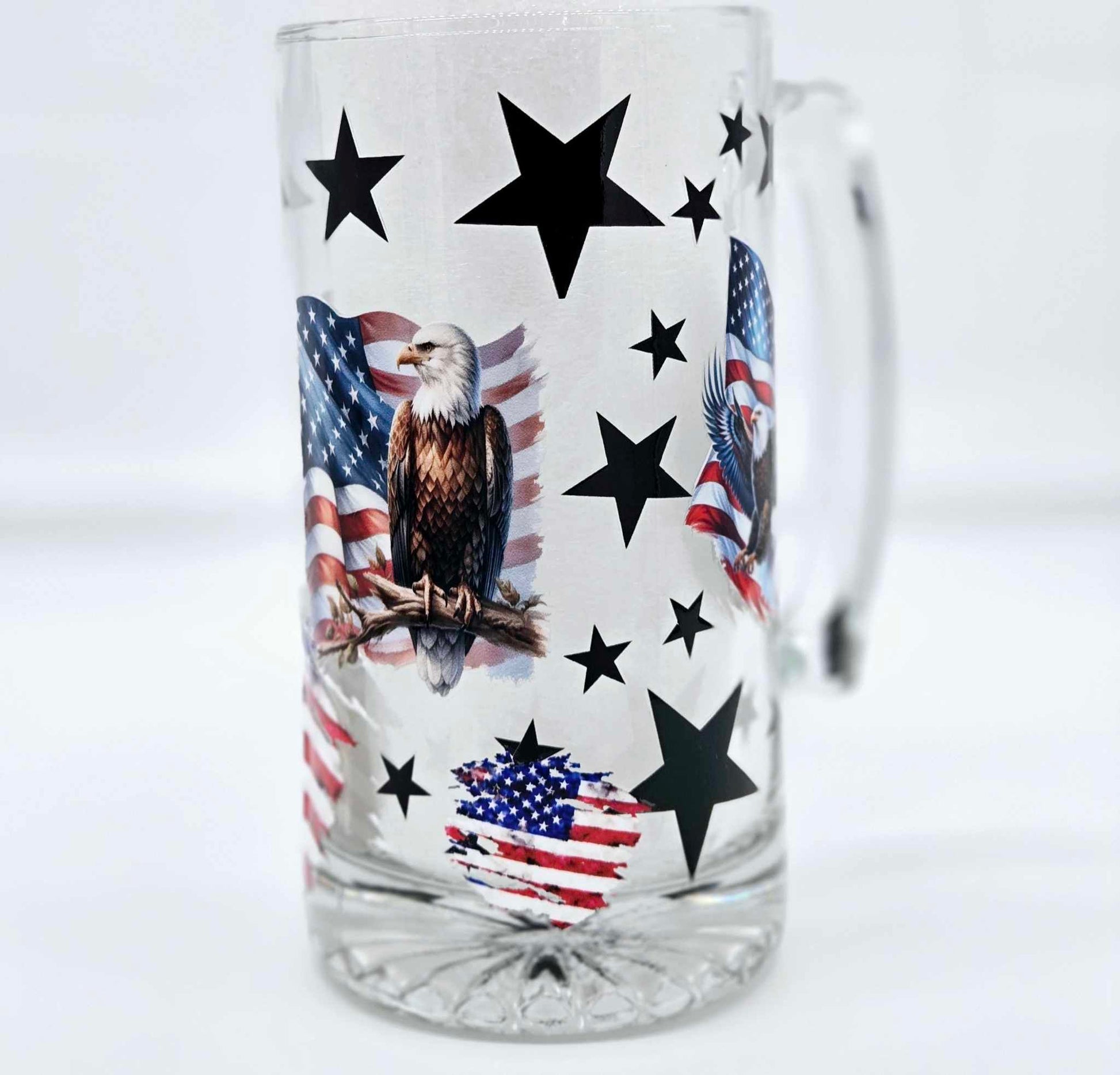 Embrace your patriotic spirit with the "Patriot's Pride Glass Mug". This mug is a robust 26.5 oz of quality glass craftsmanship designed to celebrate national pride and freedom. Featuring striking designs of the majestic bald eagle set against the backdrop of the American flag, this mug is a symbol of strength and unity. Decorated with stars to complete the Americana theme, this sturdy mug is perfect for enjoying your favorite beverages during national holidays, sporting events, or everyday moments of pride. Make a toast to liberty with every sip!
