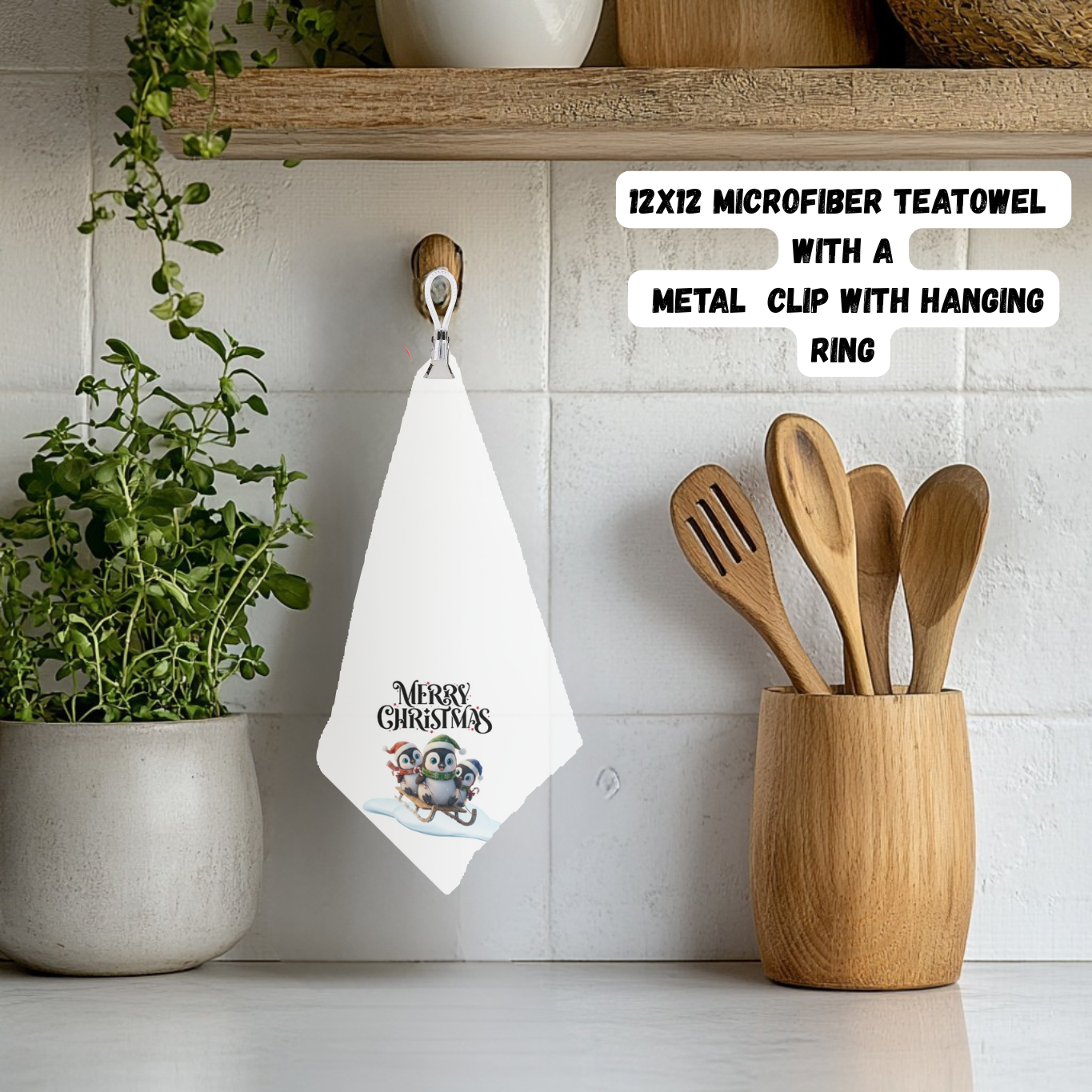 Add festive cheer to your kitchen with our Penguin Pals “Merry Christmas” 12x12 Microfiber Tea Towels! Each towel features a delightful penguin trio design that brings a cozy, joyful holiday touch to your space. Made from soft, ultra-absorbent microfiber, these towels are perfect for drying hands, dishes, or quick cleanups. The metal clip with hanging ring makes them easy to attach anywhere—perfect for kitchens, bathrooms, or even campers! Choose from two adorable designs — Sledding Penguins or Snowy Penguin Trio — and enjoy both function and festive style all season long.