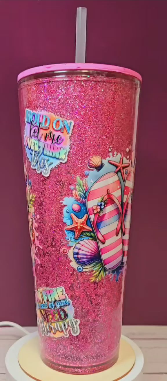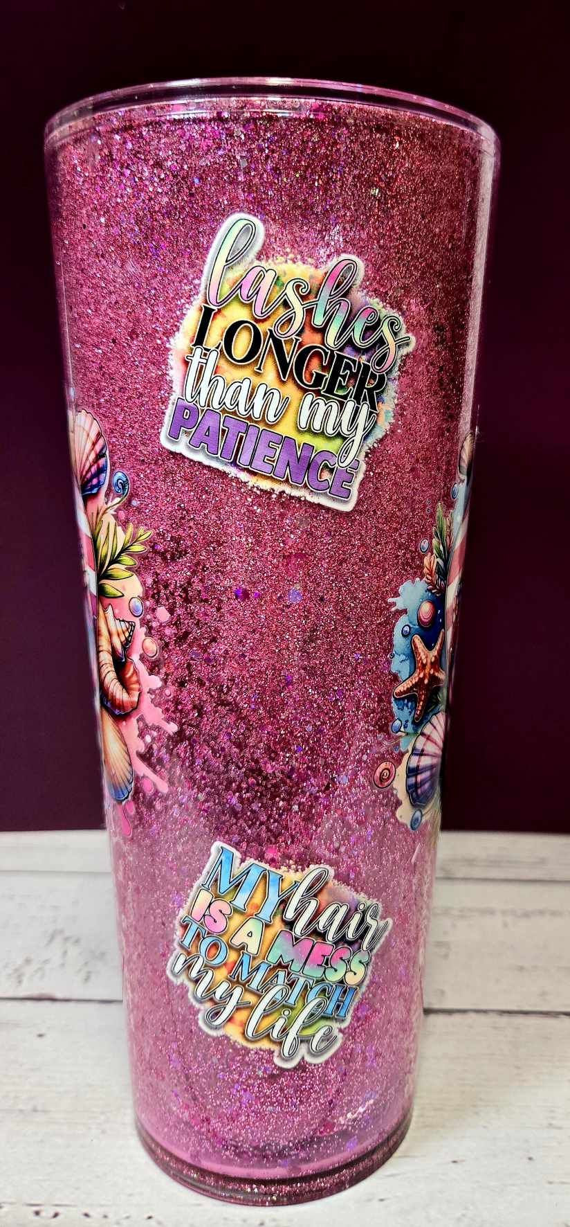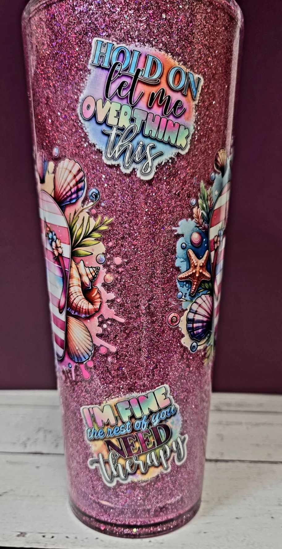 Unleash your playful side with our "Pink Whimsy Glitter Tumbler," a delightful fusion of sparkle and sass. This tumbler dazzles in a vivid pink glitter, creating a mesmerizing effect that's as fun as it is functional. It’s adorned with relatable phrases like "Hold on let me overthink this," "I'm fine the rest of you need therapy," "Lashes longer than my patience," and "My hair is a mess to match my life," making it the perfect choice for anyone who loves a touch of humor with their hydration. Ideal for those days when you need a little sparkle to match your mood, this tumbler is sure to be a conversation starter. Whether you’re at the office, gym, or lounging at home, it’s the perfect way to enjoy your favorite drinks while flaunting your quirky style. Grab one for yourself or gift it to someone special who appreciates a good laugh and a lot of glitter.