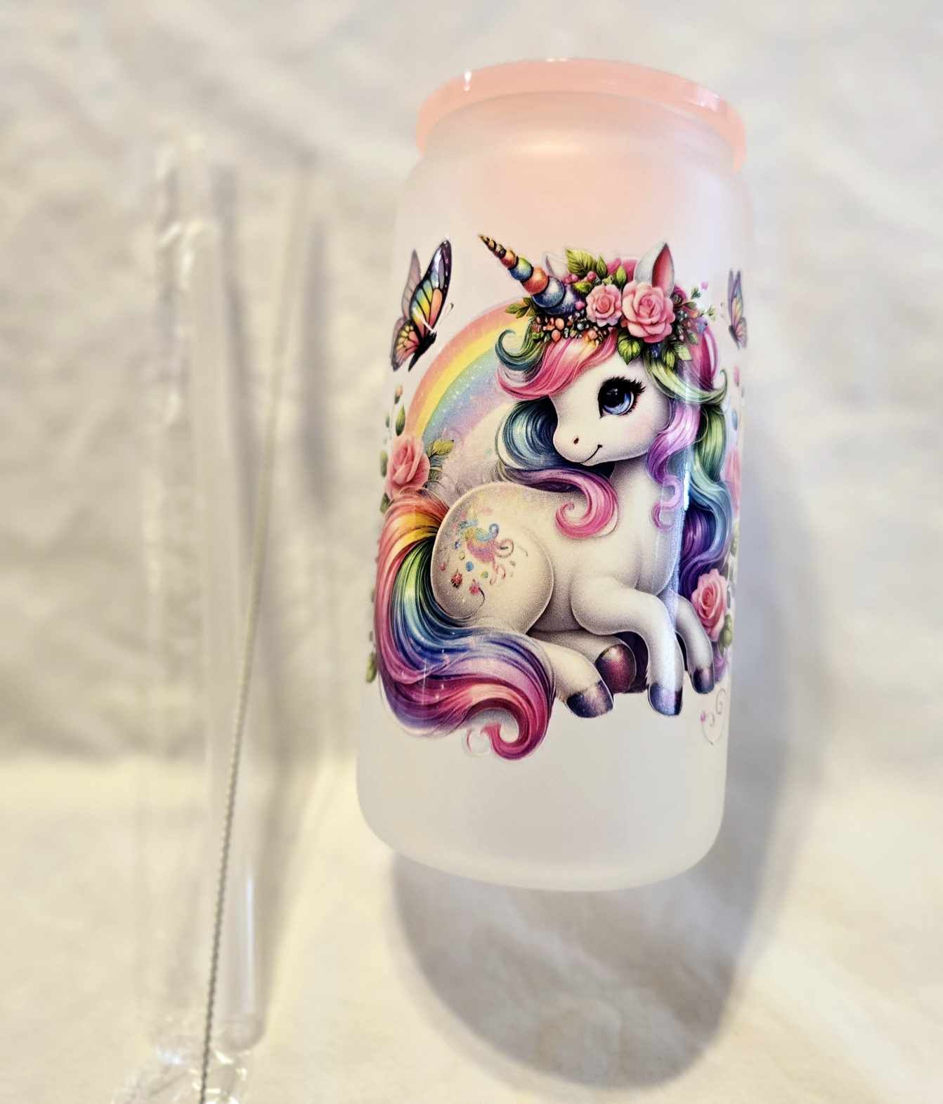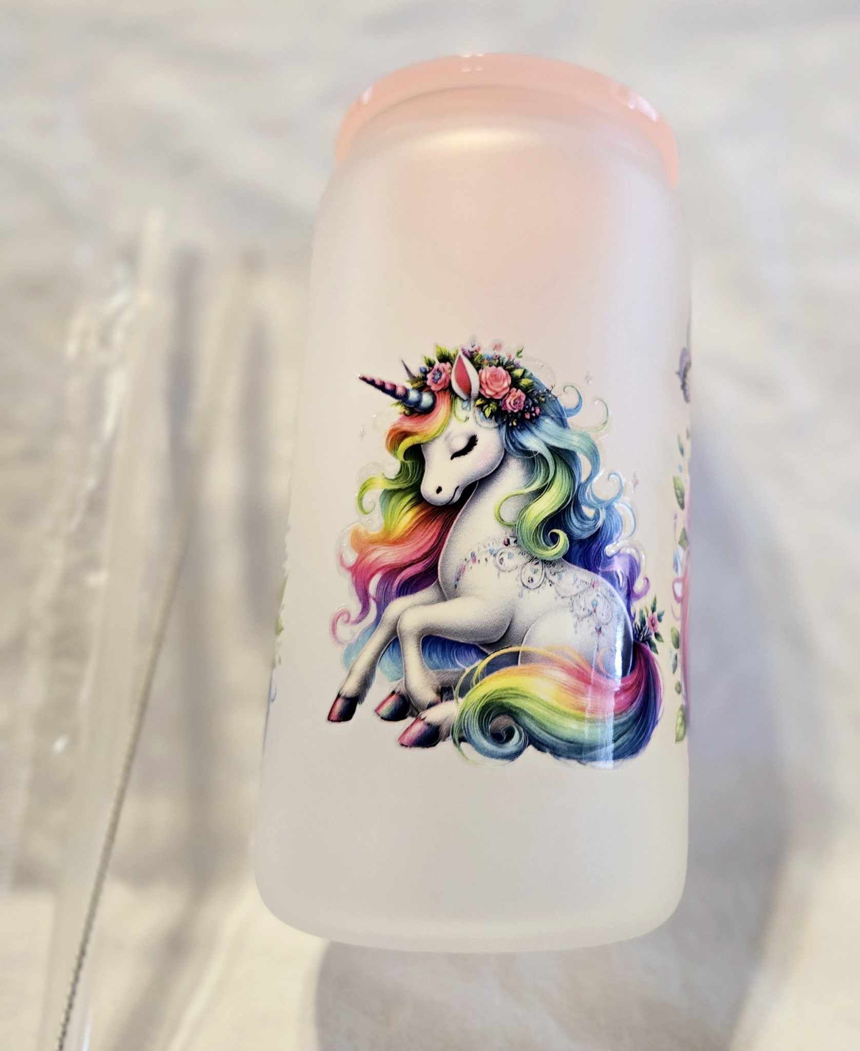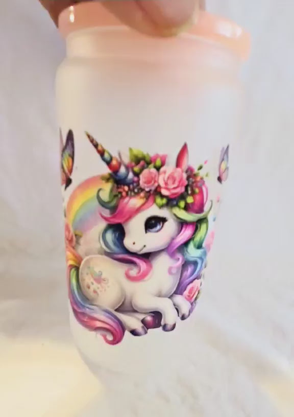 Drift into a world of fantasy with our Rainbow Whisper Unicorn Frosted Tumblers. Each 16-ounce tumbler is a canvas of wonder, featuring a serene unicorn adorned with vibrant, rainbow-colored mane and a cascade of floral embellishments. The soft pastel colors blend beautifully with bright highlights, creating an ethereal effect that enchants at first glance. Perfect for those who believe in magic and the beauty of dreams, this tumbler includes a soft pink lid, reusable straw, and a straw cleaner for an enchanting sipping experience. Whether as a gift for a unicorn enthusiast or a delightful addition to your own collection, it promises to inspire and delight.