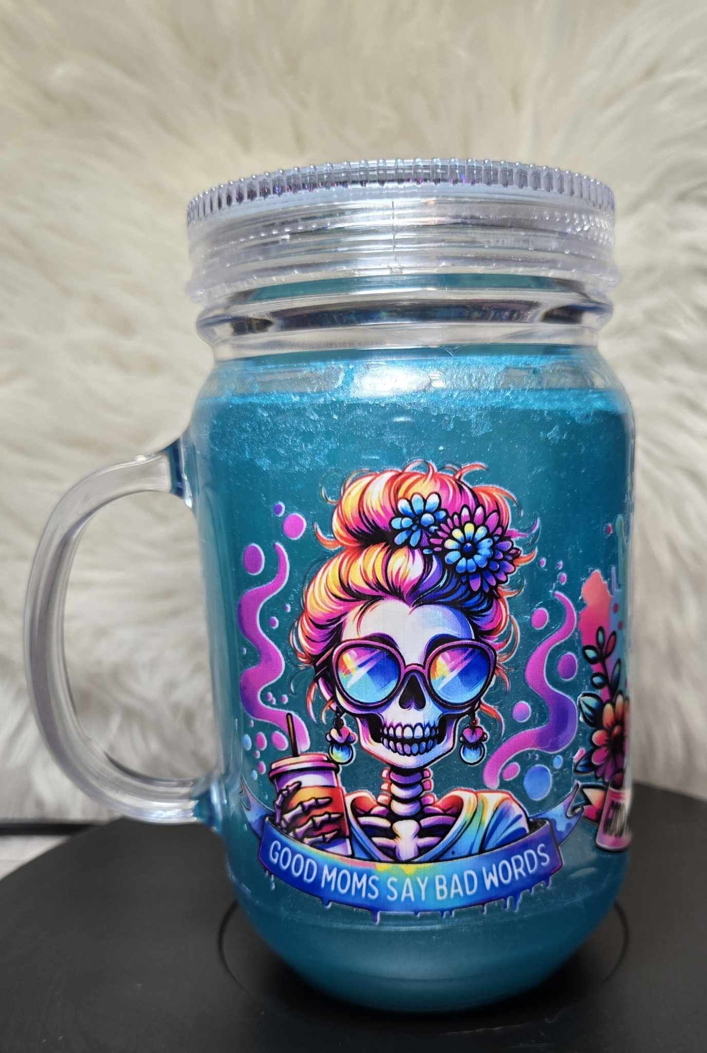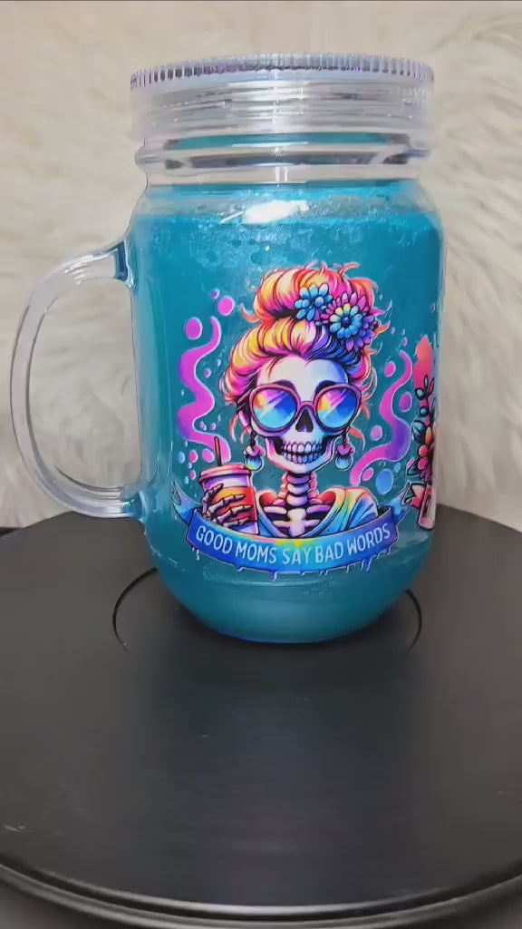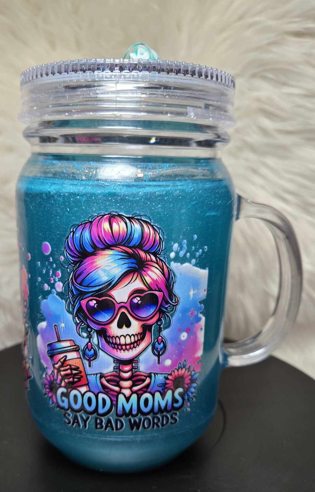 Celebrate the spirited side of motherhood with our "Rebel Mom Snowglobe Tumbler." This bold and playful 20 oz double-wall plastic tumbler captures the essence of fun-loving moms who embrace life with a touch of sass. Featuring a vividly colored skull adorned with a stylish hairdo, floral accents, and cheeky sunglasses, this design shouts "Good Moms Say Bad Words," making it a perfect nod to the moms who know a good laugh and a few 'bad words' can make any day better. Each tumbler is filled with sparkling glitter and charming flower decorations on the lid, creating a magical snowglobe effect that dazzles with every sip. Whether it's for coffee mornings, water breaks, or cocktail evenings, this tumbler is a fantastic gift for any mom who loves to keep it real and a little rebellious. Add some sparkle and edge to your drinkware collection and show off your fun side in style!