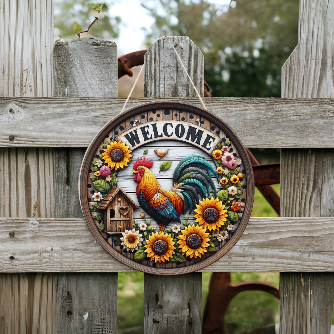 Bring a touch of rustic charm to your home with our Rooster & Sunflower Farmhouse Welcome Sign! This vibrant 10-inch round sign features a proud rooster surrounded by cheerful sunflowers, a quaint birdhouse, and sweet florals—set against a shiplap-style backdrop. With its rich colors and welcoming vibe, it’s perfect for front doors, garden gates, fences, or entryways.