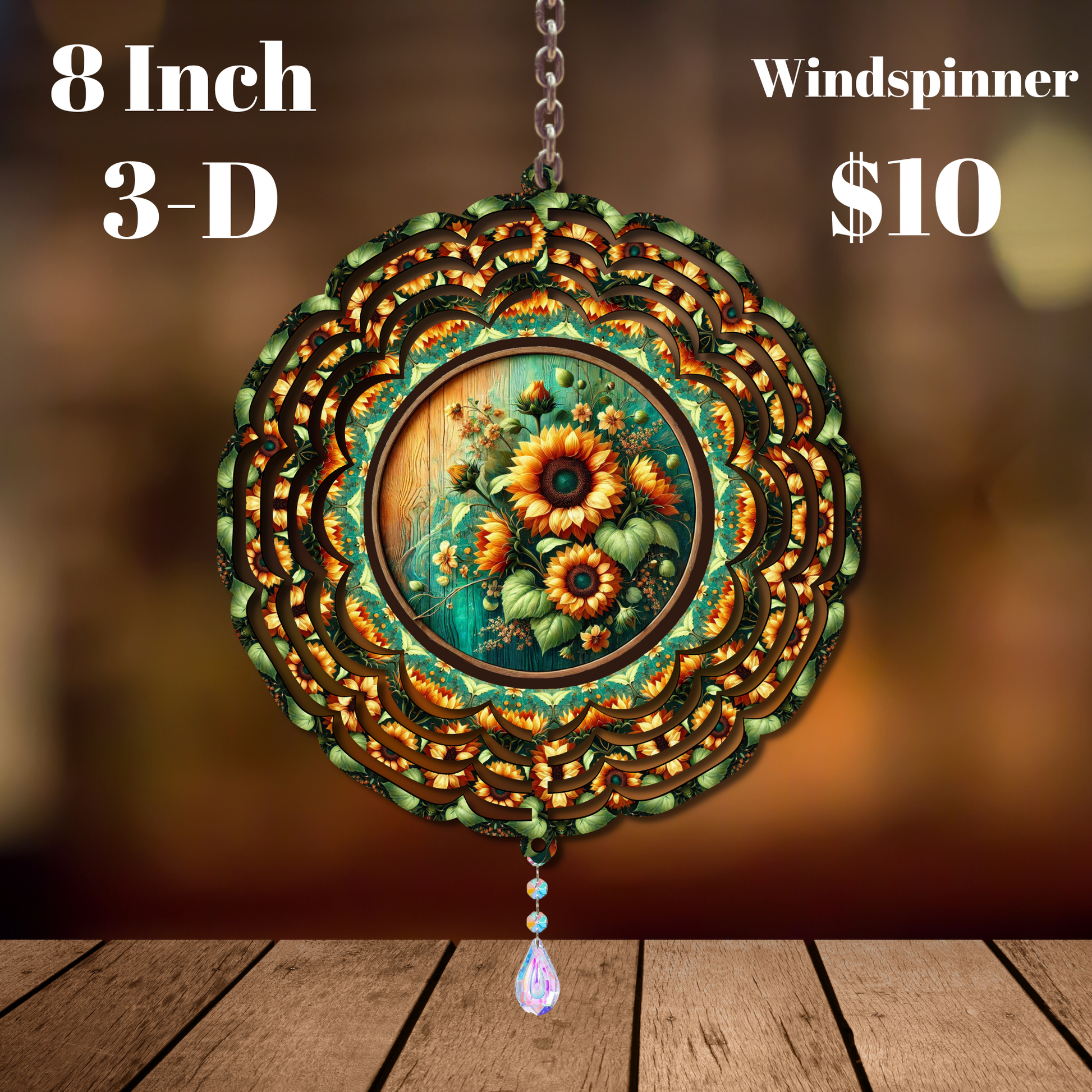 The Rustic Sunflower Harvest Windspinner is a celebration of nature's beauty, designed to bring a touch of rustic charm to your outdoor decor. This exquisite 8-inch spinner features a lush centerpiece of sunflowers nestled in a vintage wooden setting, surrounded by a detailed 3-D pattern that mimics the rich textures of autumn. Each layer of the spinner is carefully crafted to catch the light and breeze, creating a dynamic, rotating display of colors and shadows. A delicate crystal drop adds a final touch of elegance, sparkling as it dances in the sun. Available for just $10, this windspinner is perfect for those who love to infuse their surroundings with the warmth and joy of the harvest season.