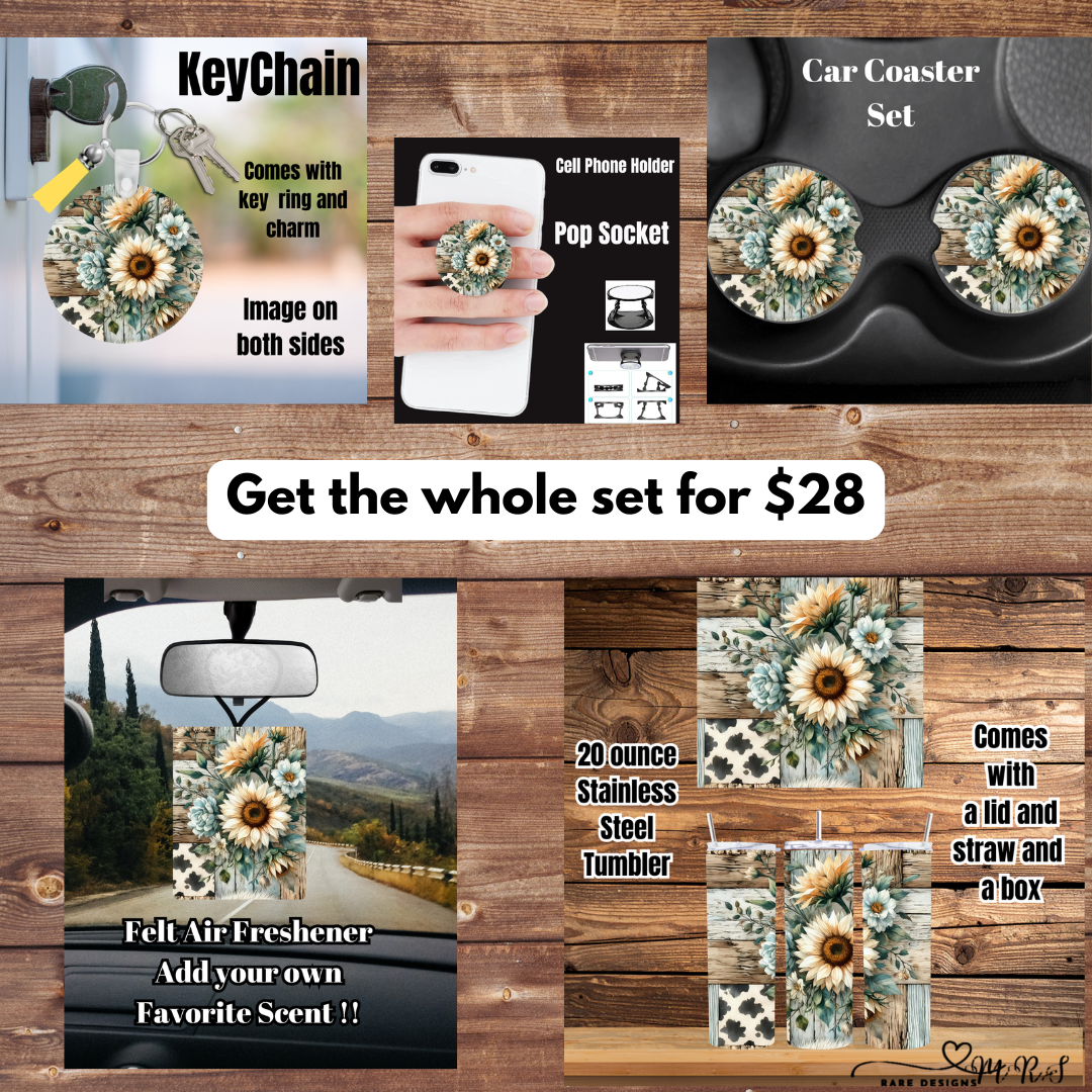 Grab the whole matching bundle and save! Our Rustic Sunflower Patchwork Car & Sip Gift Set from MRS Rare Designs wraps cozy farmhouse art across everyday essentials for your ride and coffee runs.