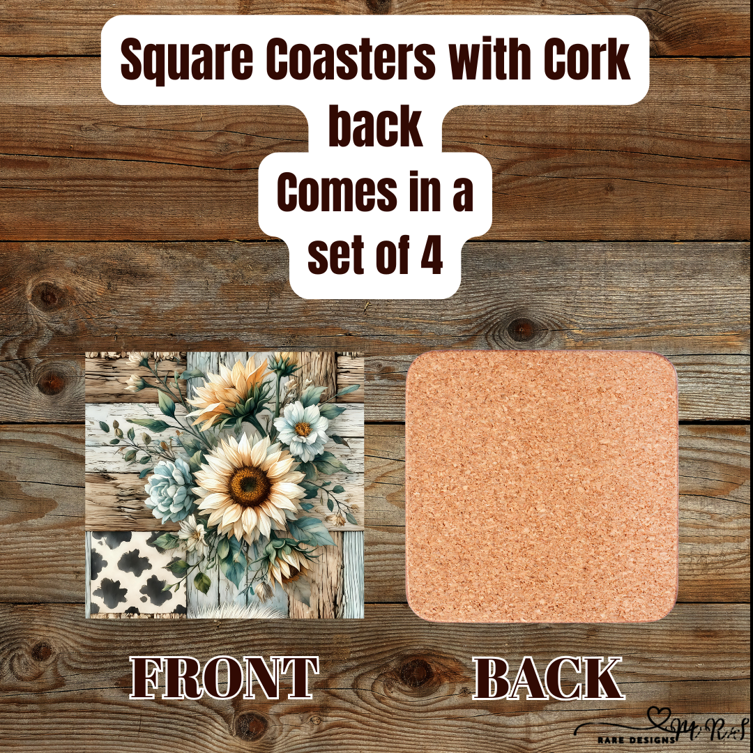 Protect your tables in cozy farmhouse style. Our Rustic Sunflower Patchwork square drink coasters from MRS Rare Designs come as a set of four with non-slip cork backs to keep glasses steady and surfaces safe from drips and condensation. The durable, high-resolution top shows a sunflower bouquet over a weathered-wood patchwork print that looks gorgeous on coffee tables, kitchen islands, and tiered trays. Great for everyday use and gift baskets—pair with our matching tumblers or candle lantern for a coordinated set. Care: wipe clean; do not soak or place in dishwasher.