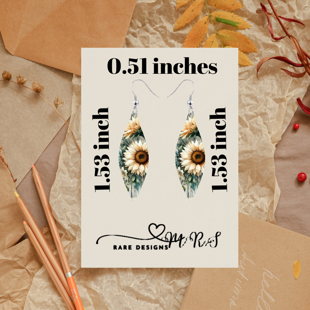 Rustic Sunflower Patchwork Sublimation Earrings — Leaf/Marquise, 1.53″ x 0.51″