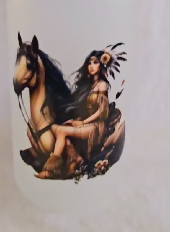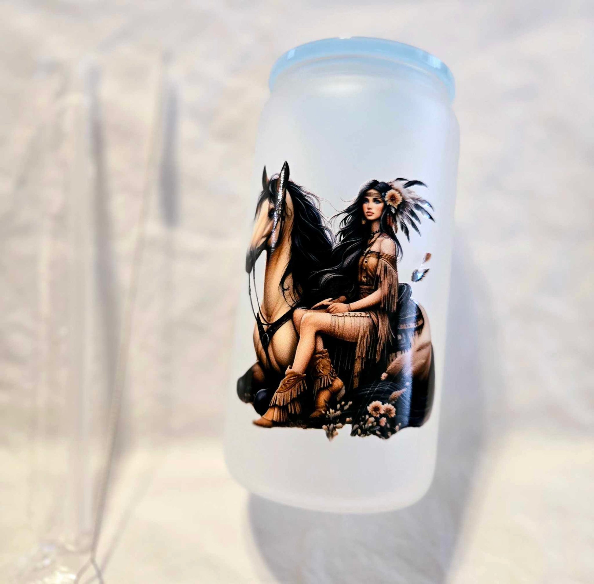 Experience the majestic allure of the Spirit of the Plains Frosted Tumblers, a celebration of heritage and unbridled freedom. This 16-ounce frosted glass tumbler beautifully depicts a native-inspired scene featuring a poised woman and her loyal horse, set against a serene natural backdrop. The artwork, adorned with intricate details and rich earth tones, captures the spirit and resilience of the plains. Ideal for those who appreciate art that tells a story or for anyone drawn to the beauty of equine and native cultures. This tumbler comes with a sky-blue lid, a reusable straw, and a straw cleaner, combining functionality with an artistic touch. Perfect for everyday use or as a unique gift for art lovers and free spirits alike.