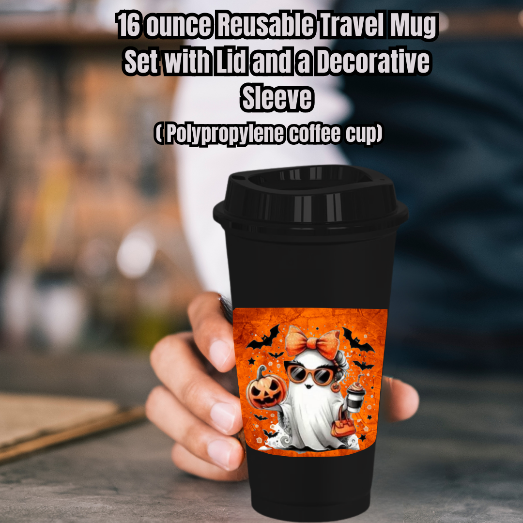 Spooky Chic Ghost Travel Mug Collection – 16oz Reusable Coffee Cups with Decorative Sleeves