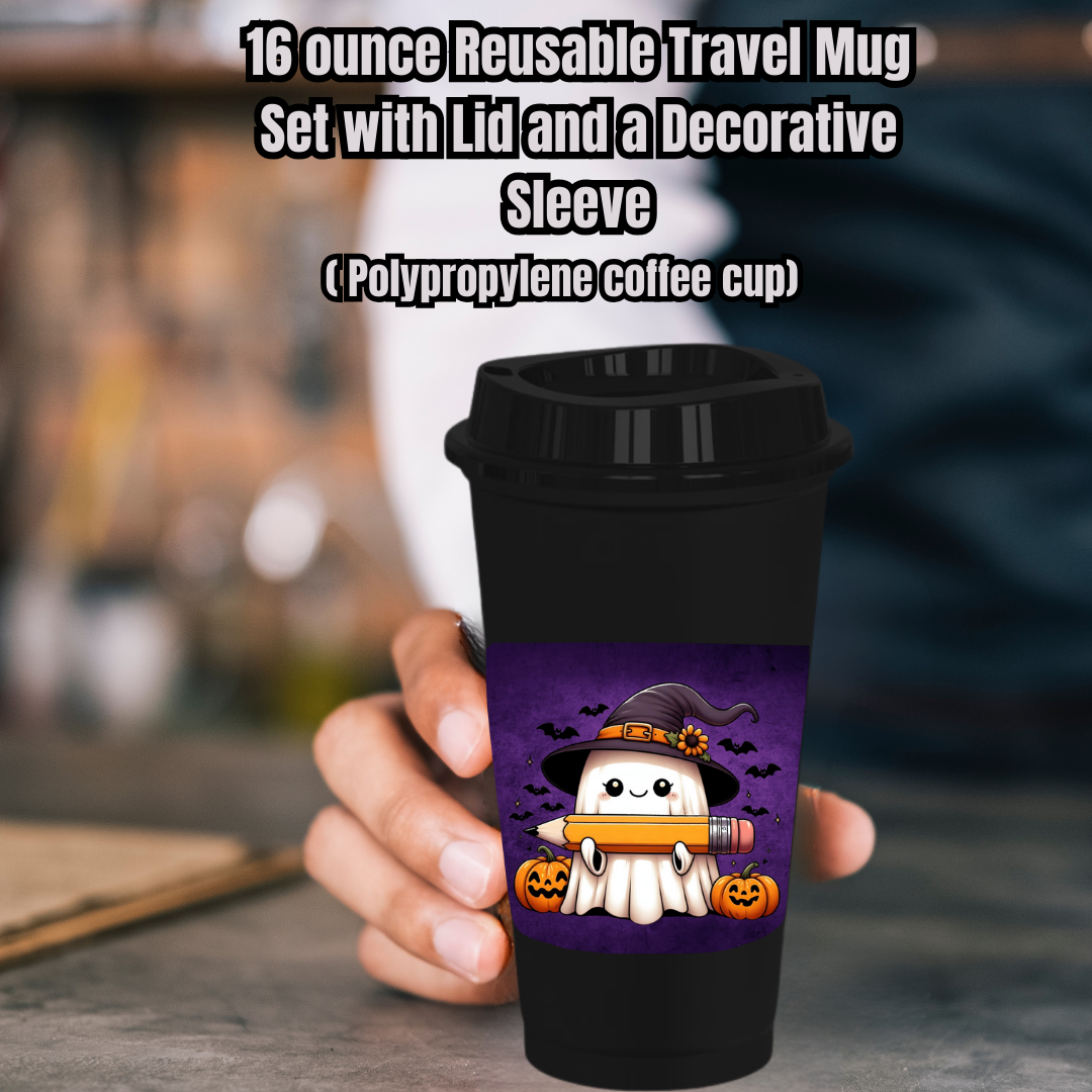 Spooky Scholar Ghost Mug Collection – 16oz Reusable Travel Mugs with Decorative Sleeves