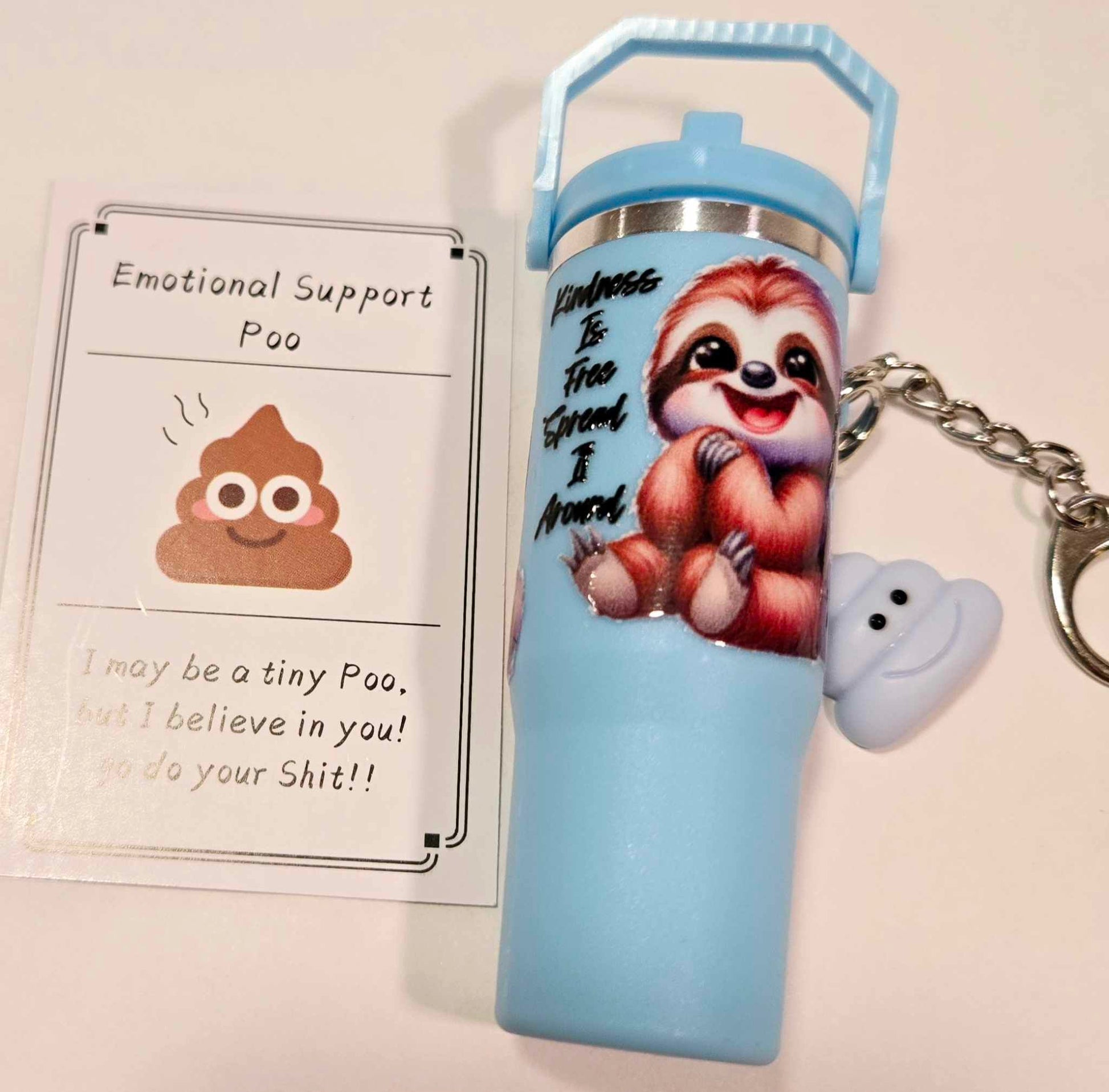 Slow down and spread a little kindness with our "Spread Kindness" Sloth Chapstick Keychain Duo. This heartwarming set features an adorable sloth with a joyful smile, clutching a heart, and surrounded by the inspiring message, "Kindness is free, spread it around." The keychain is enhanced with a cute poop emoji charm and comes with a sturdy clip for easy attachment to your belongings. Inside the chapstick holder, discover an encouraging card that reads, "Emotional Support Poo: I may be a tiny poo, but I believe in you! Go do your shit!!" and a hydrating chapstick to keep your lips as soft and sweet as the message you carry.