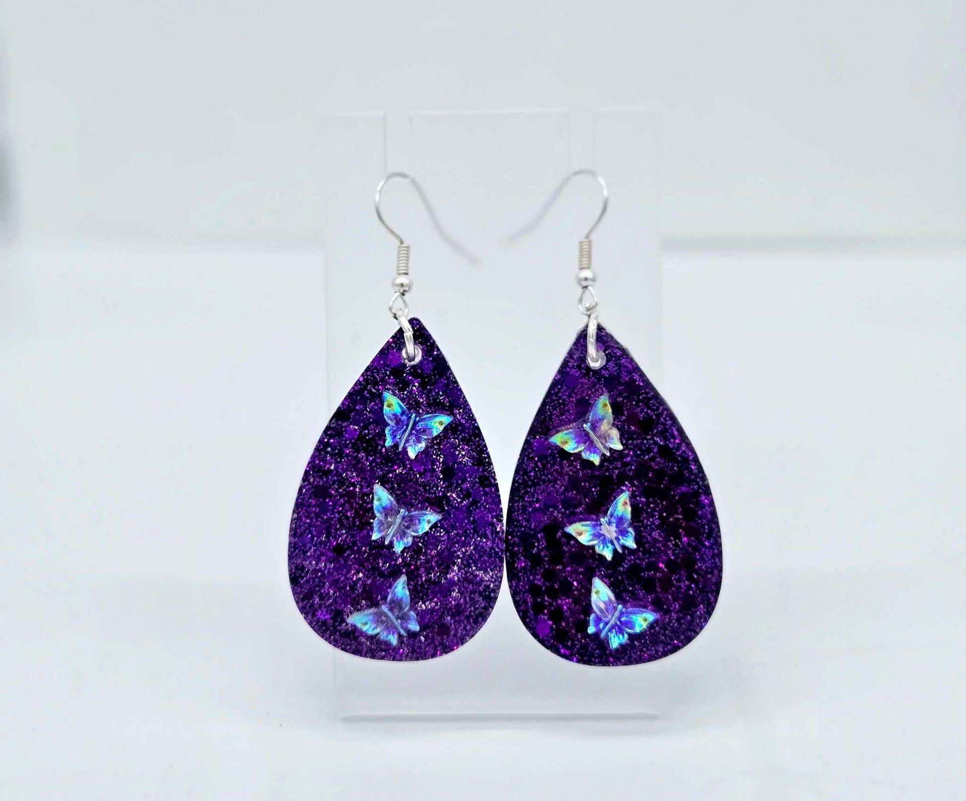 "Capture the magic of the night sky with our Stardust Butterfly Resin Earrings. Each earring is a miniature canvas of deep violet resin sprinkled with stardust-like sparkles and adorned with delicate blue butterflies. Handcrafted at MRS Rare Designs, these earrings are not just jewelry, they're wearable art that offers a perfect blend of fantasy and elegance. Ideal for adding a touch of whimsy to your everyday wear or as a captivating accessory for special occasions."