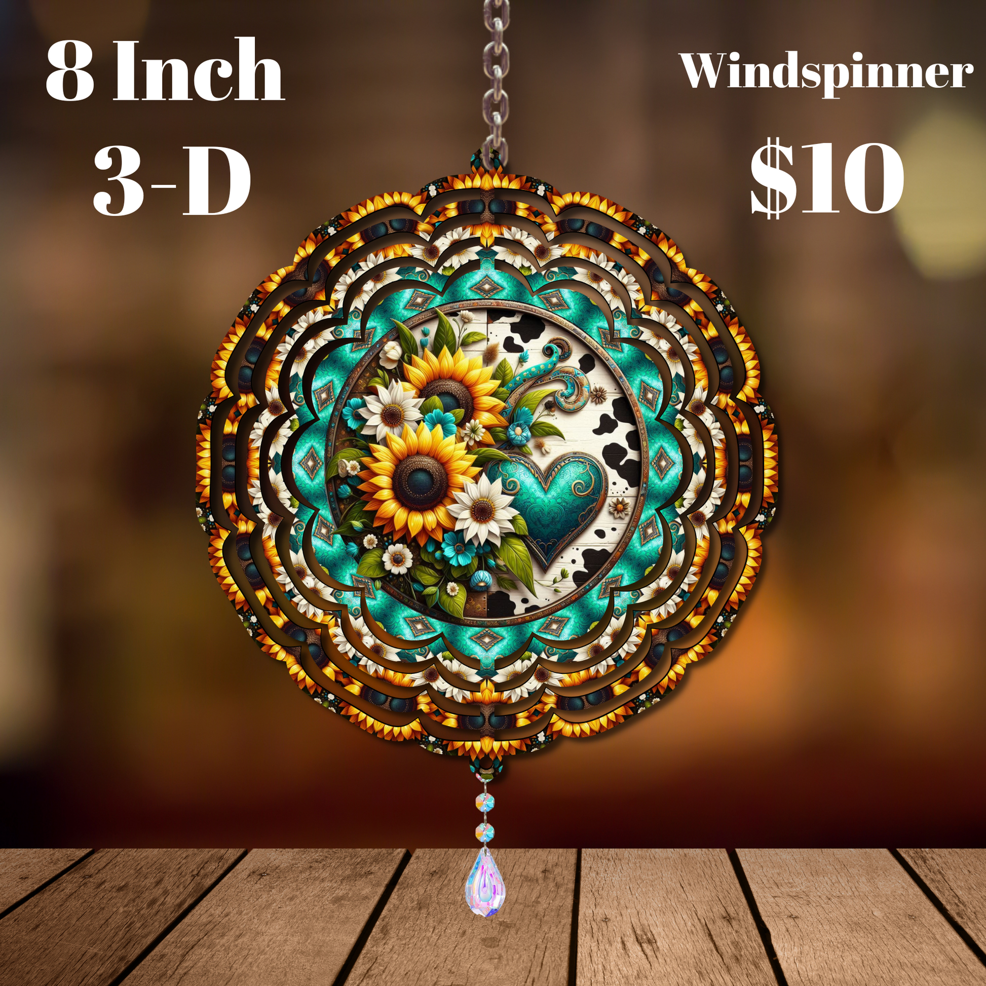 Introducing the Sunflower Serenity 3D Wind Spinner, a beautifully crafted piece that brings a vibrant splash of color and peaceful motion to any space. This 8-inch wind spinner displays a dazzling arrangement of sunflowers and ornate patterns, set in a vivid turquoise backdrop that evokes a sense of calm and joy.