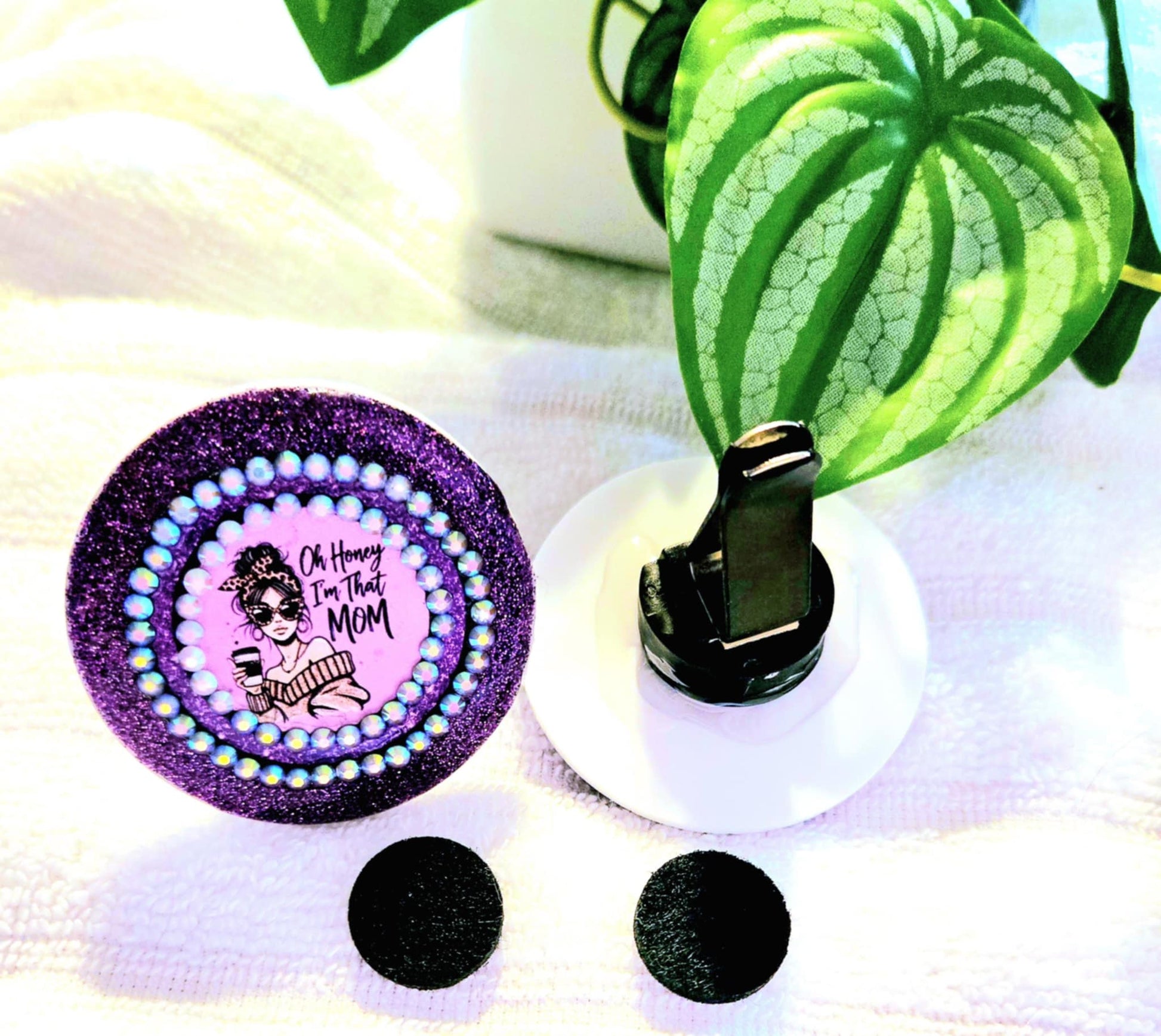 Turn your car into your personal glam zone with our That Mom Energy Scented Vent Clips! 💅 Each one is handmade with glittery resin, dazzling rhinestones, and a bold design that proudly says, "Oh Honey, I'm That MOM." These vent clips don’t just bring style—they’re functional too! Each comes with a felt pad that lets you add your favorite essential oil or perfume scent to keep your ride smelling fabulous.