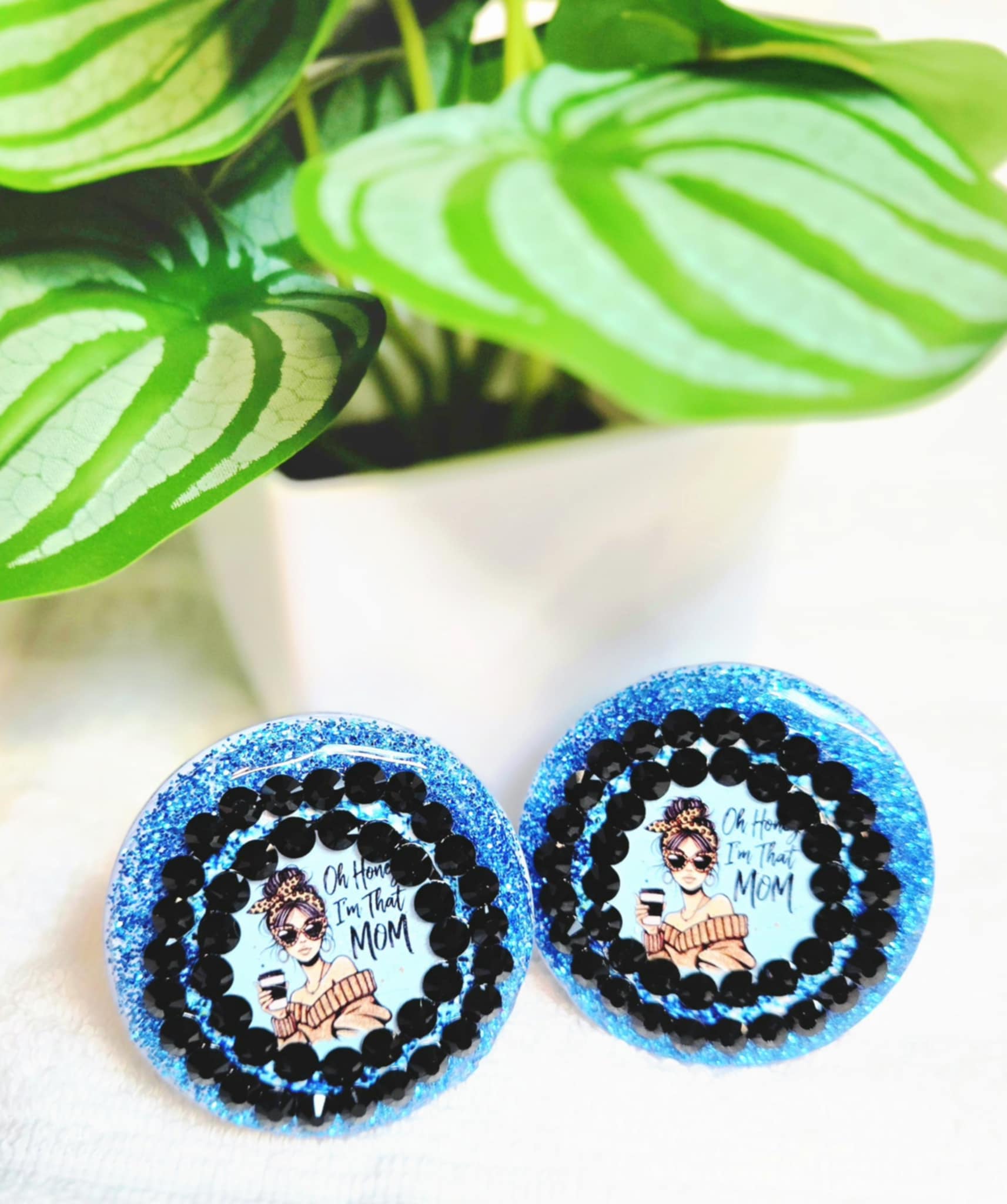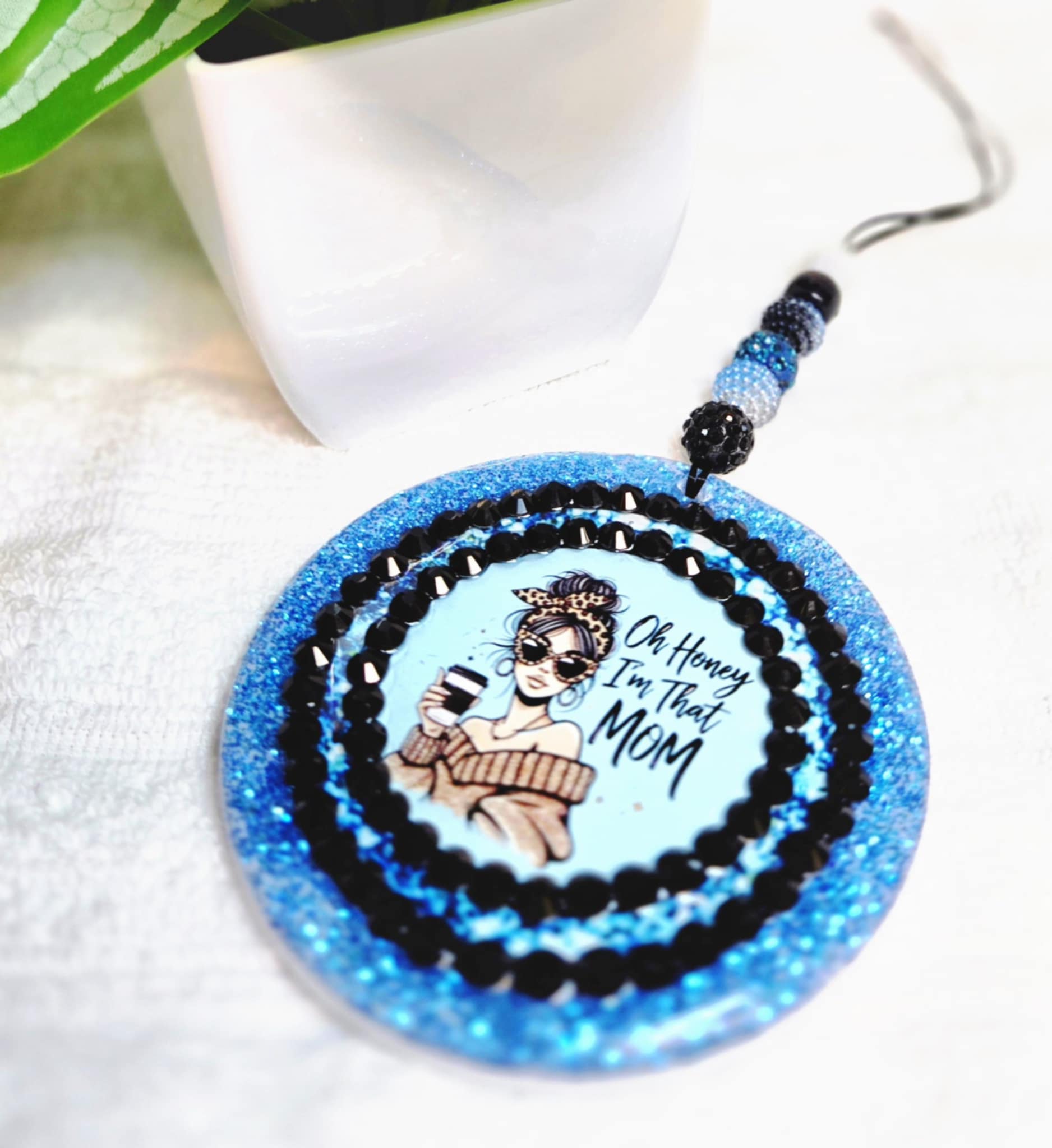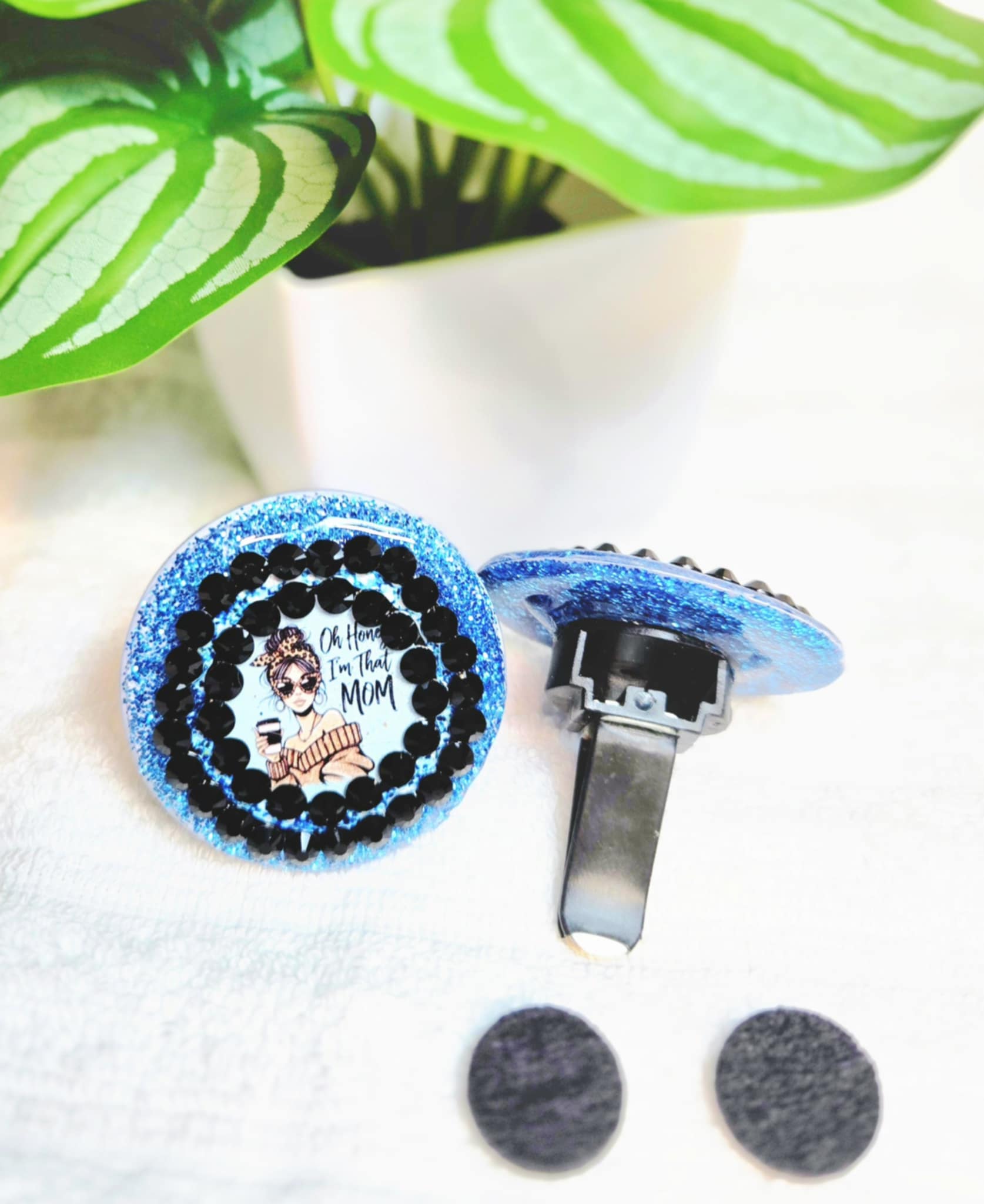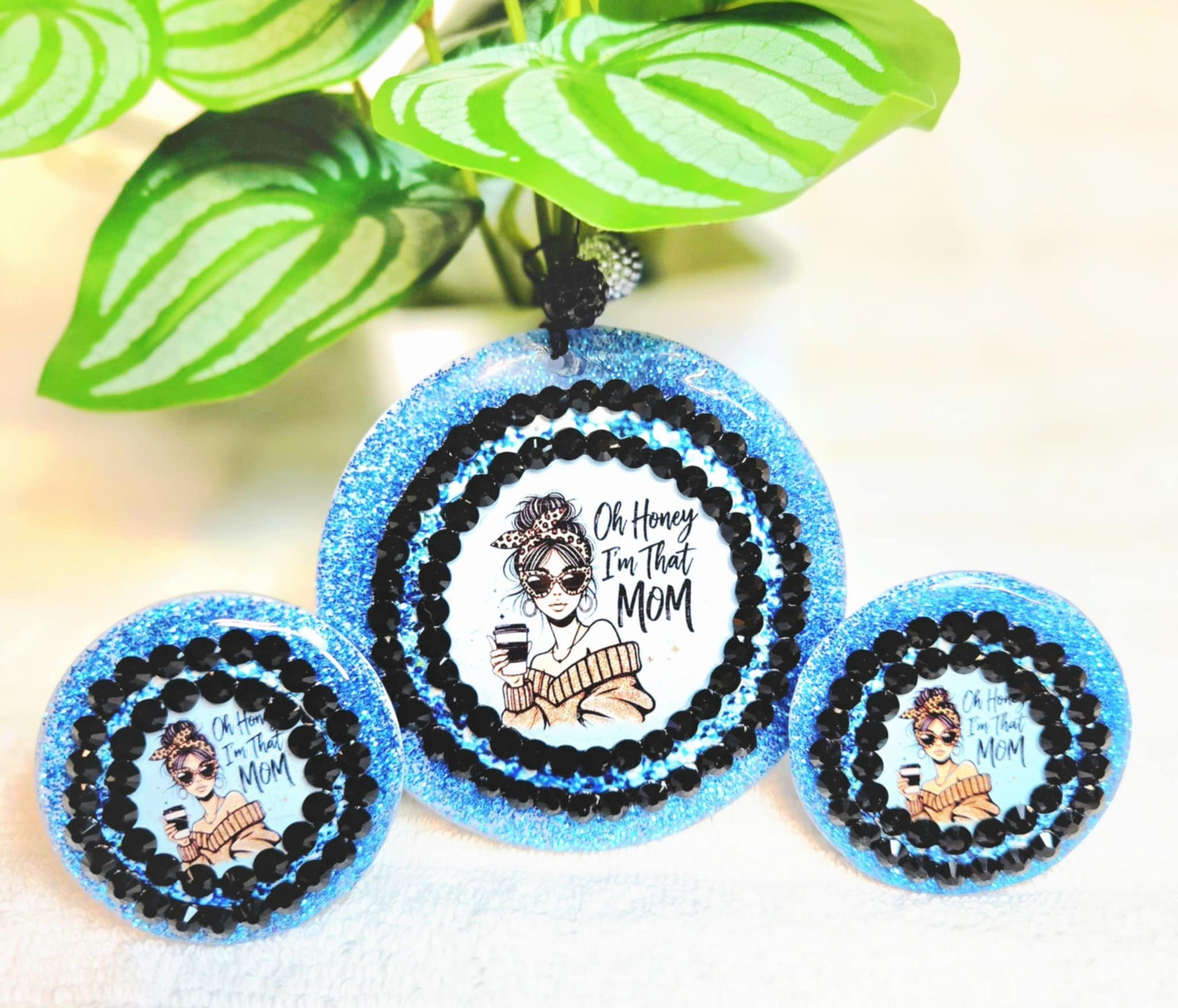 Make no mistake—you ARE that mom, and now your car can say it too! The That Mom Life Car Charm & Clip Set features a trendy design with a sassy mom sipping coffee, rocking sunglasses, and radiating unapologetic confidence. Surrounded by bold black rhinestones and dazzling blue glitter, this set is the perfect car accessory for moms who own their style and their space.