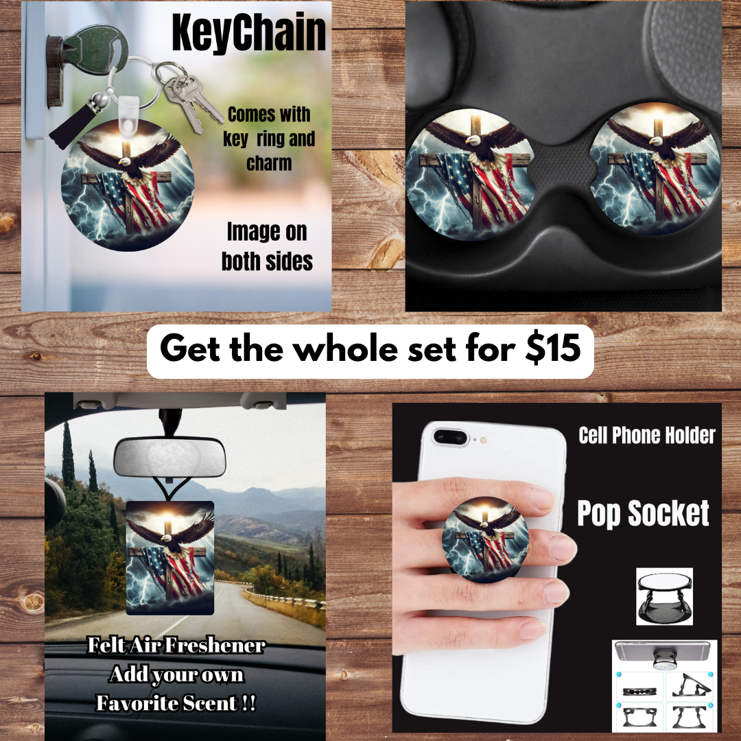 Show your unwavering faith and patriotism with the "Eagle & Cross" Collection. This series of bundles features a bold, powerful design of a bald eagle and an American flag-draped cross set against a stormy, lightning-filled sky. Each bundle includes a core set of matching car accessories, perfect for adding a touch of personal style and meaning to your vehicle: