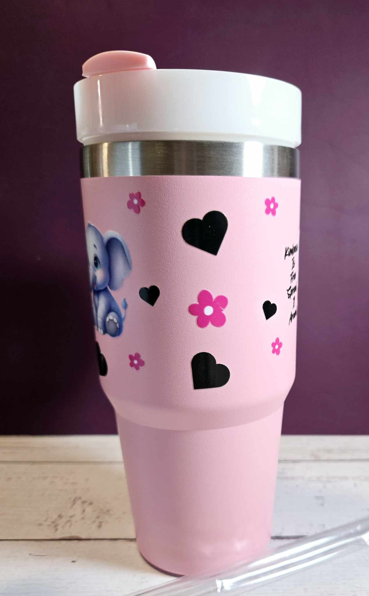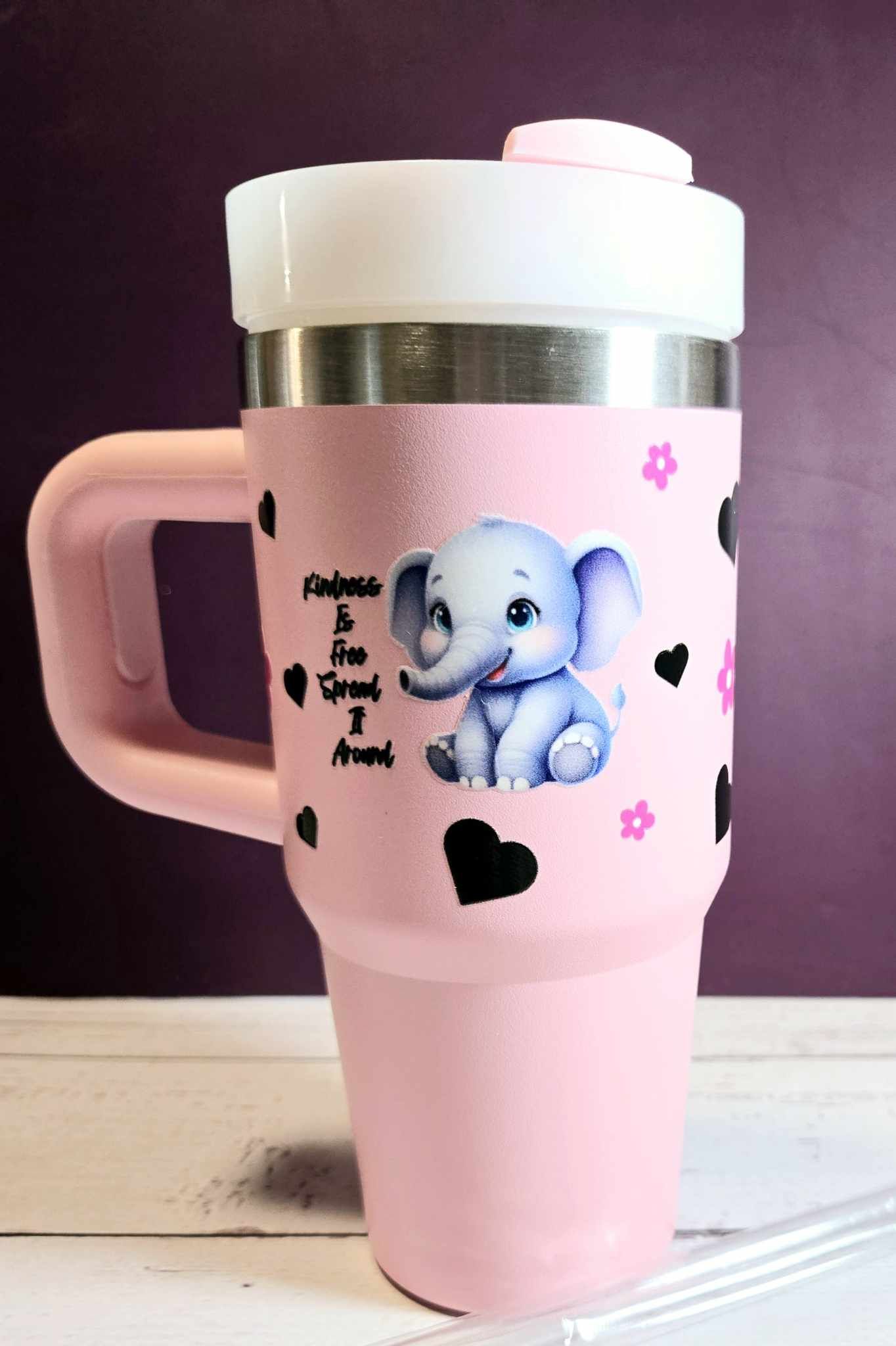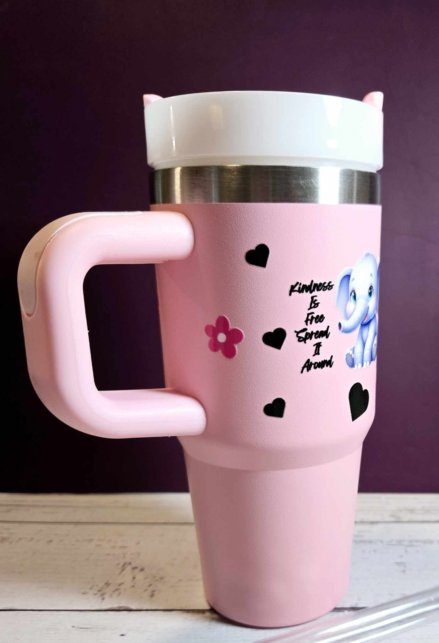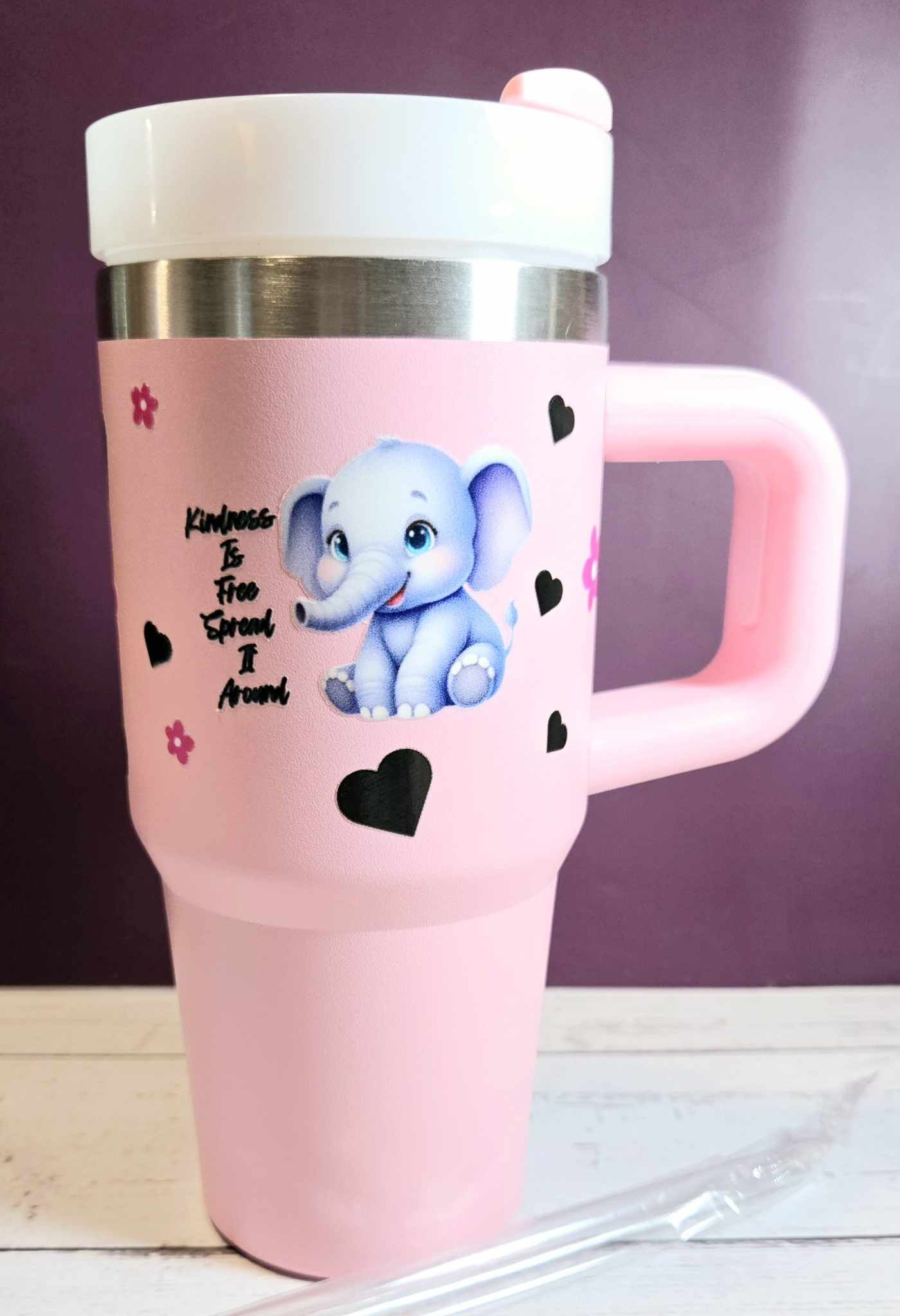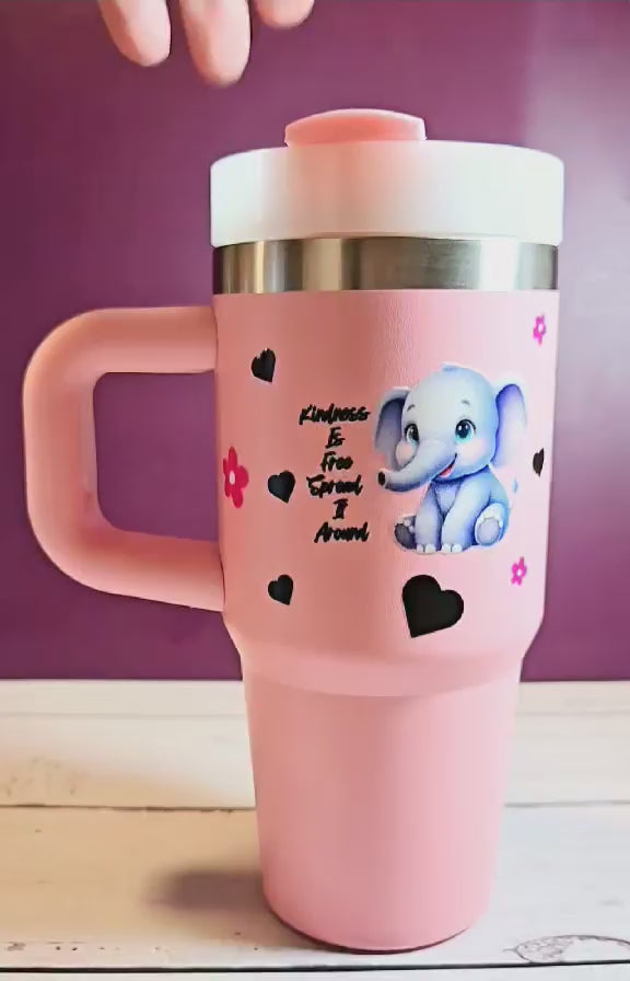"Spread kindness like confetti with our Tiny Trunk Kindness Tumbler! This charming 30oz stainless steel tumbler is perfect for keeping your drinks hot or cold while you're on the go. Adorned with a cute baby elephant and inspiring words, 'Kindness is free, spread it around,' it's designed to add a touch of joy and a lot of heart to your day. Featuring a comfortable handle and a secure flip-top lid, this tumbler is as practical as it is sweet. Perfect for gift-giving or treating yourself, it's a delightful reminder that small gestures can make a big difference."