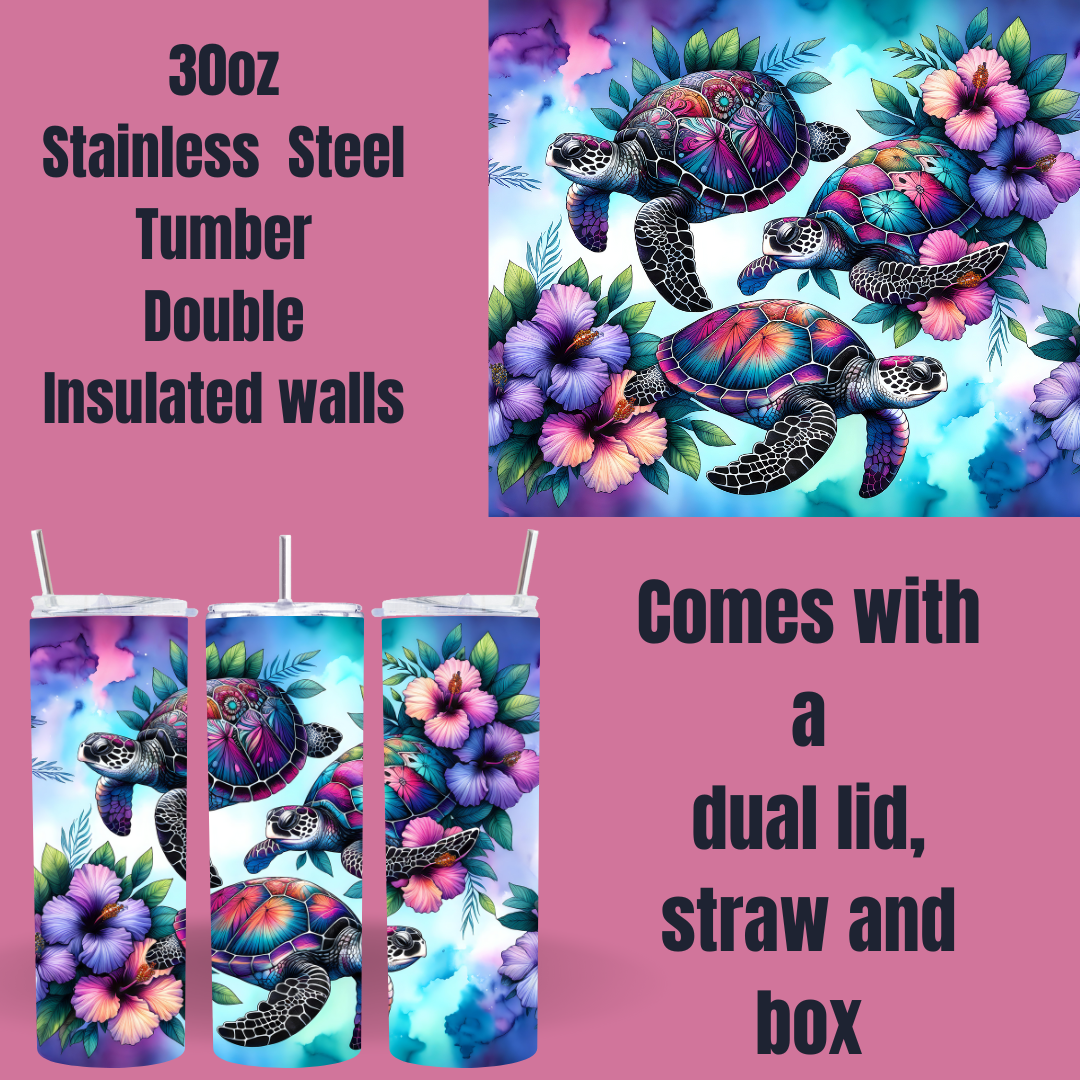 Sip in serene island style with our Tropic Tides Sea Turtle Tumbler in a larger 30oz size! Featuring a vibrant design of radiant sea turtles and blooming hibiscus flowers, this stainless steel tumbler delivers big on both beauty and performance. With double insulated walls and a generous capacity, it’s your perfect companion for long days at the beach, road trips, or staying hydrated at your desk.