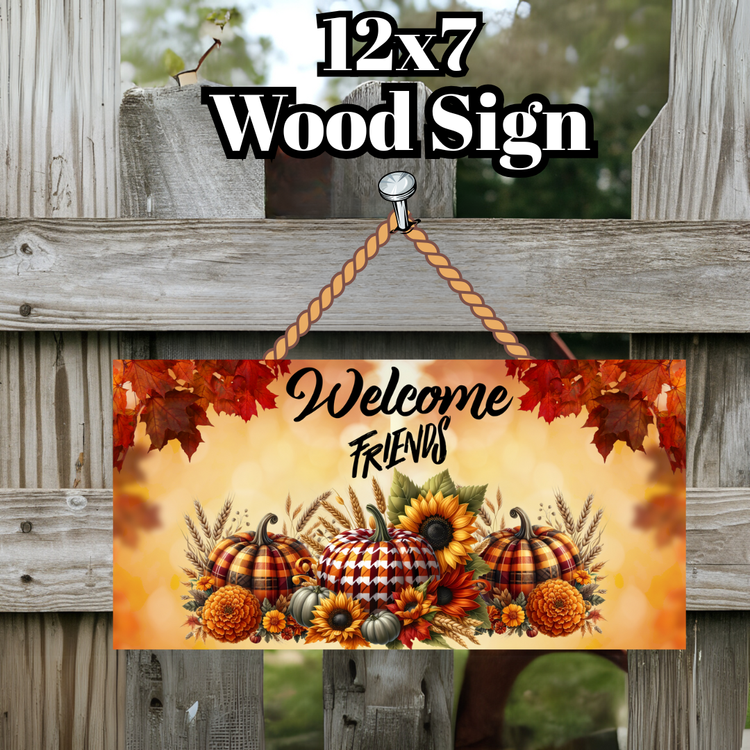 Add a warm seasonal touch to your home with our 12x7 “Welcome Friends” Fall Pumpkin Wood Sign. Crafted with a rustic farmhouse style, each sign features charming plaid and patchwork pumpkins, bright sunflowers, and colorful autumn leaves against a cozy fall backdrop. Lightweight and easy to hang, this wood sign is perfect for your front porch, entryway, kitchen, or living room. It’s not only a beautiful seasonal decoration but also a heartfelt way to greet your friends and family all autumn long. Makes a thoughtful housewarming or Thanksgiving gift too!