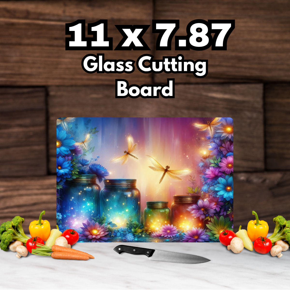 Bring a splash of enchantment to your kitchen with our Whimsical Glow Garden Glass Cutting Board. Measuring 11 x 7.87 inches, this stunning board features glowing mason jars, fluttering dragonflies, and vibrant florals in a magical garden scene. Perfect for prepping, serving, or displaying, it’s a functional work of art that adds charm and color to your space.