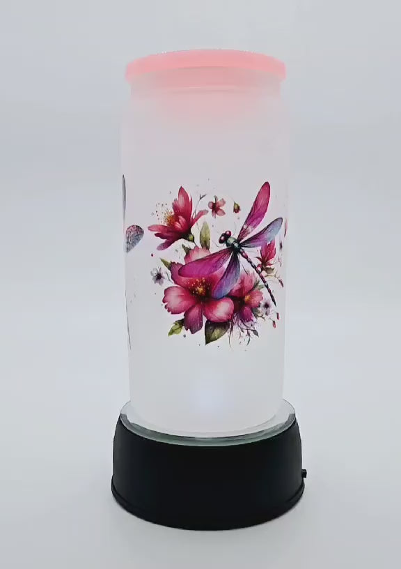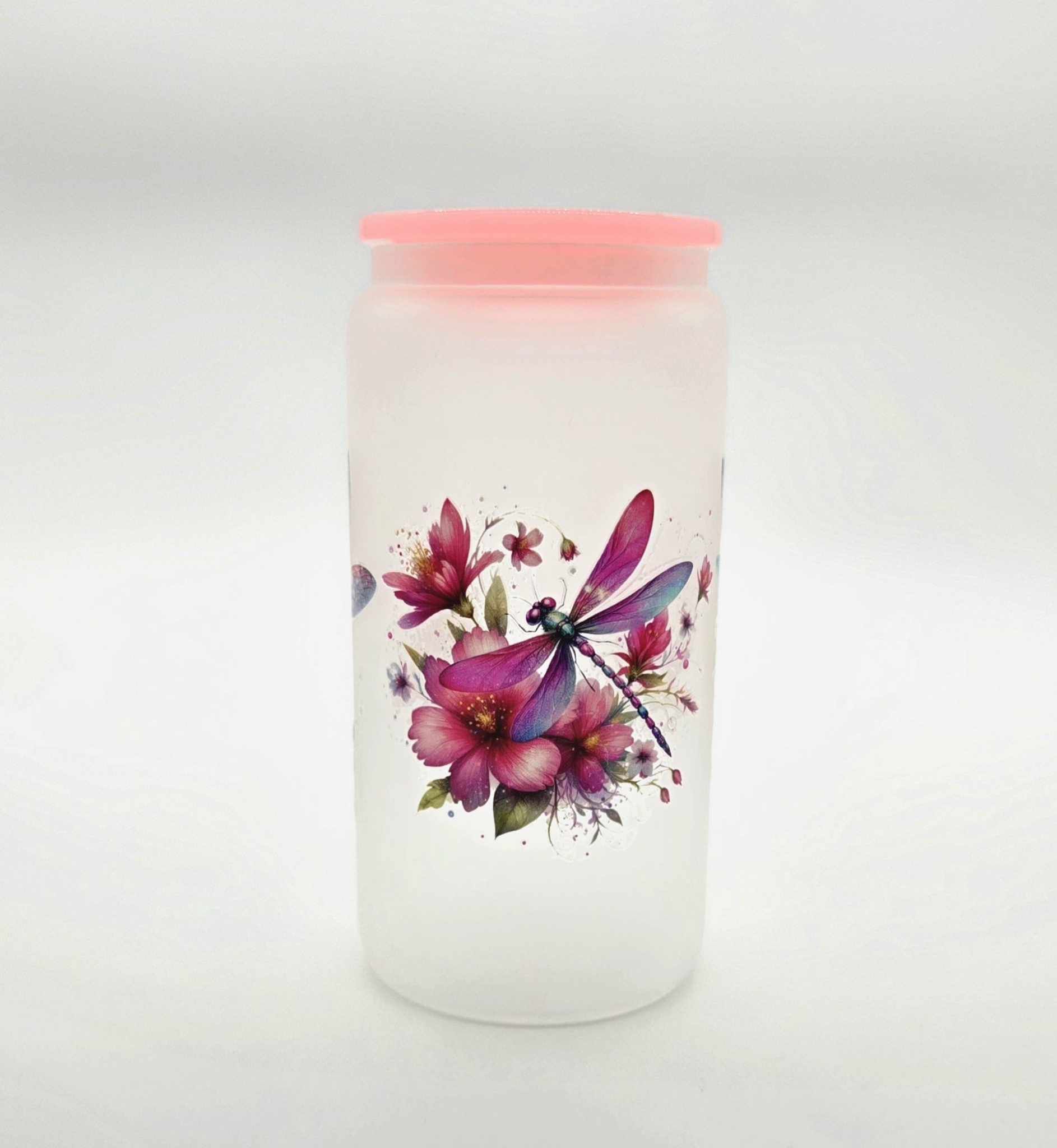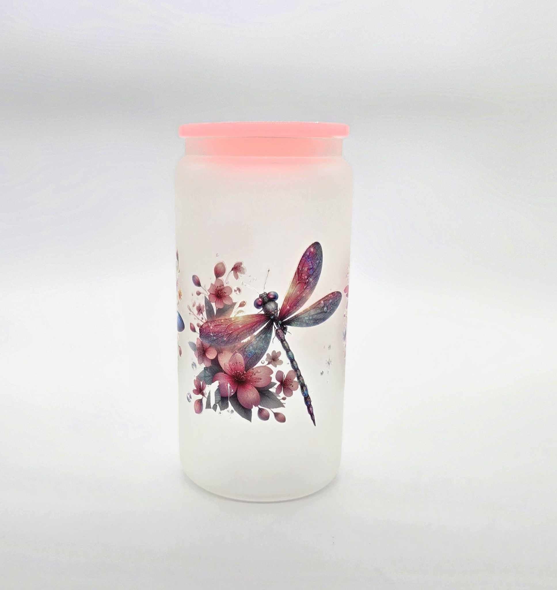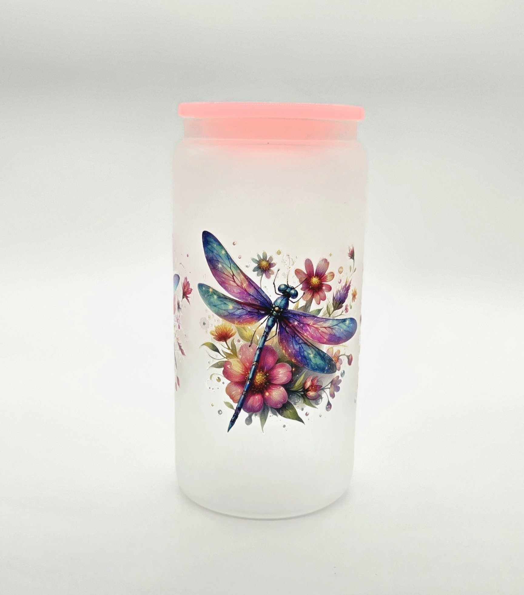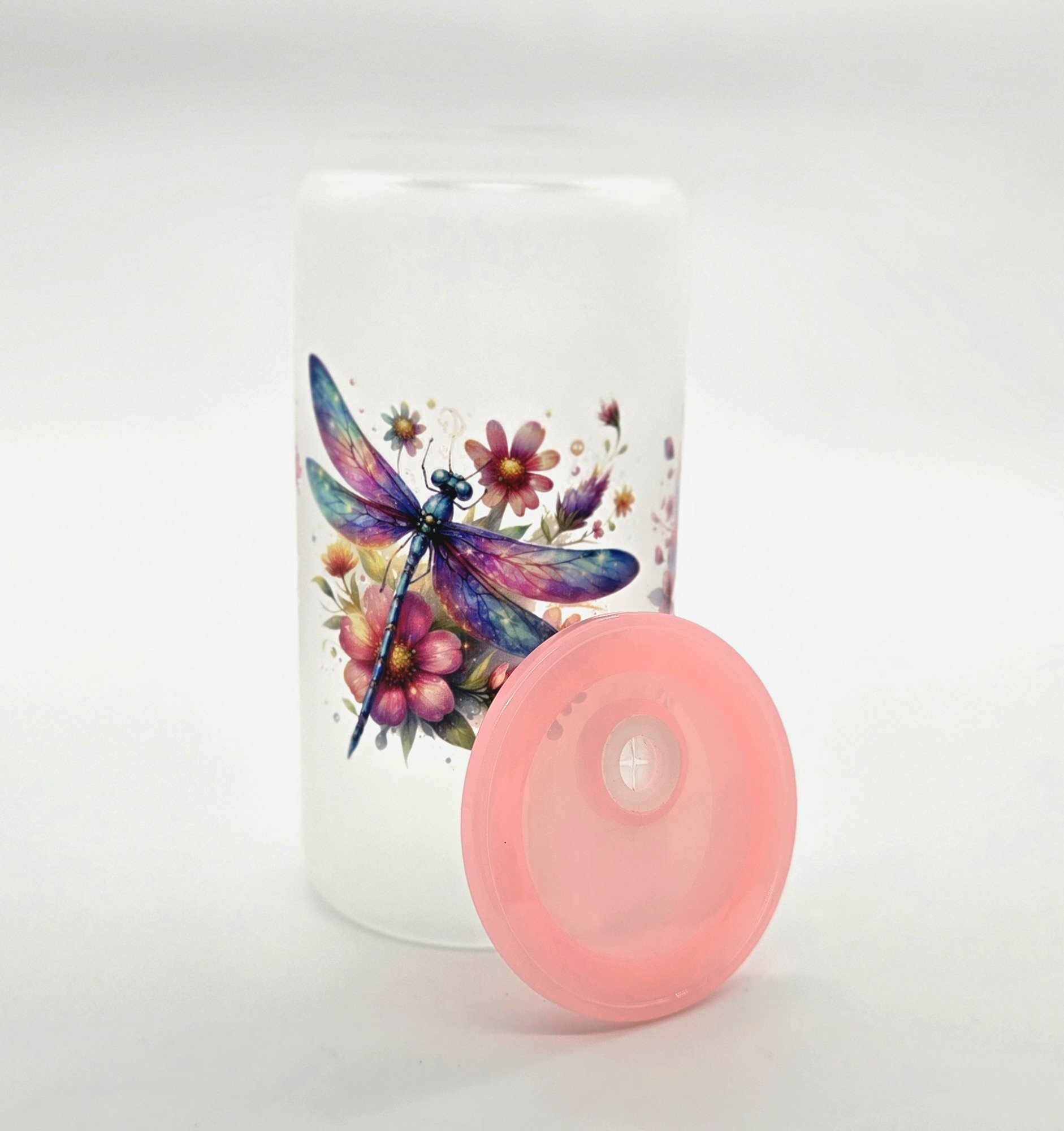 Bring a splash of magic to your everyday sipping with our Whimsy Wings Dragonfly Glass Tumbler! This 16-ounce frosted glass tumbler features breathtaking dragonfly artwork surrounded by blooming florals in dreamy hues. Topped with a soft pink silicone lid, it's both charming and practical – perfect for iced teas, fruity refreshers, or any drink that needs a little extra beauty.